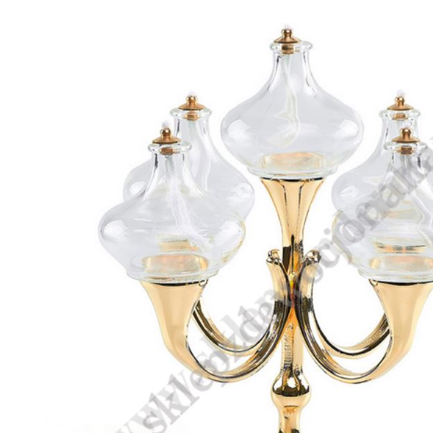 Lampa oliwna szklana „5 płomieni”. Klosze szklane transparentne, lichtarz mosiężny w kolorze złotym.