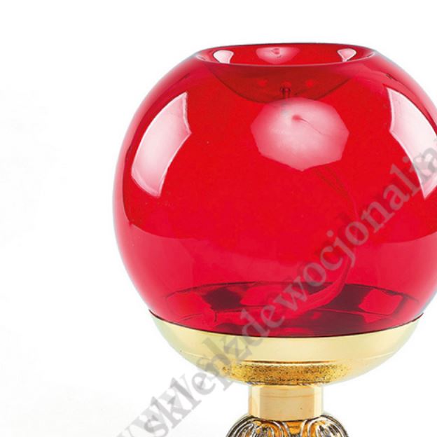 Lampka oliwna, elegancka w formie kula. Podstawą wykonana z mosiądzu, pozłacana. Dmuchane szkło w kolorze czerwonym. Pojemność – 1,7 l oleju, czas palenia ok. 10/15 dni.