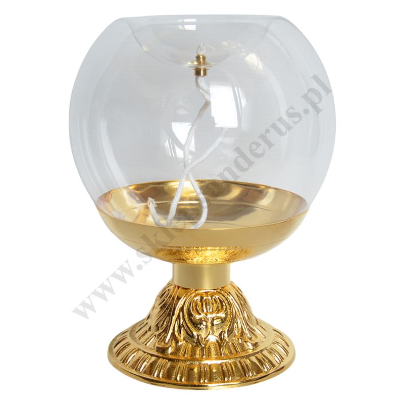 Lampka oliwna, elegancka w forma kuli. Podstawą wykonana z mosiądzu, pozłacana. Dmuchane szkło przezroczyste. Pojemność – 1,7 l oleju, czas palenia ok. 10/15 dni.