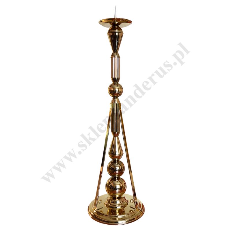 Mosiężny lichtarz pod paschał dodatkowo wzmacniany o wysokości 100 cm, średnica podstawy 32 cm, średnica górnego talerzyka 18 cm.