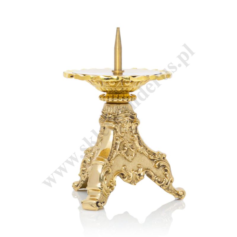Lichtarz o wysokości 12 cm wykonany z odlewu mosiężnego.