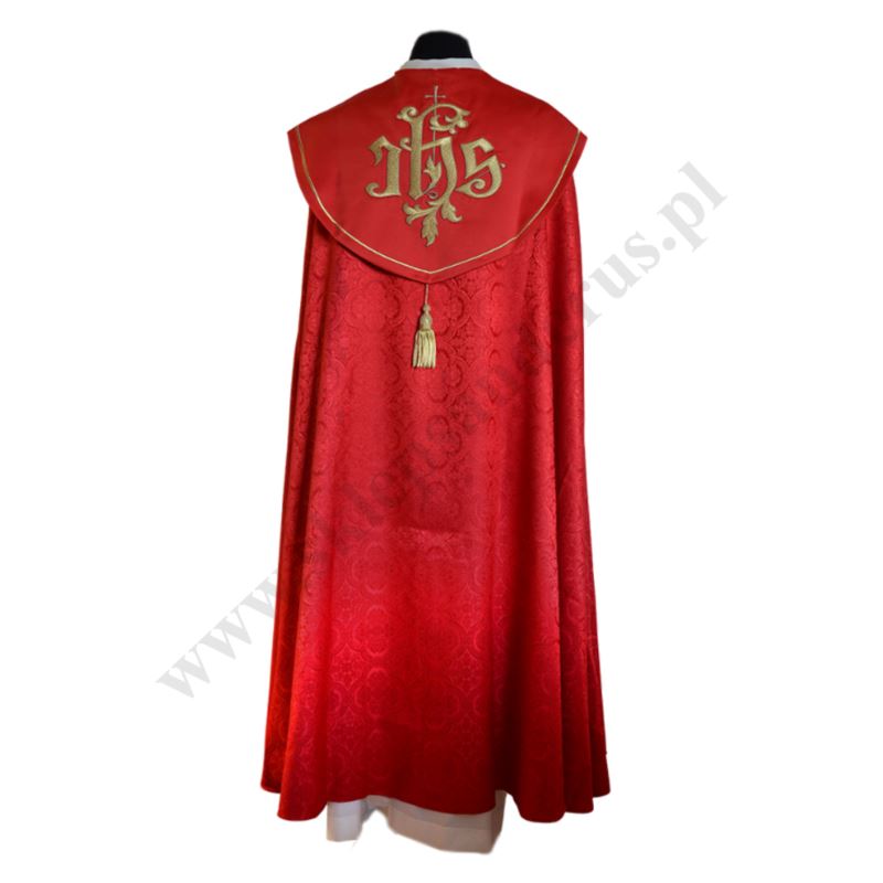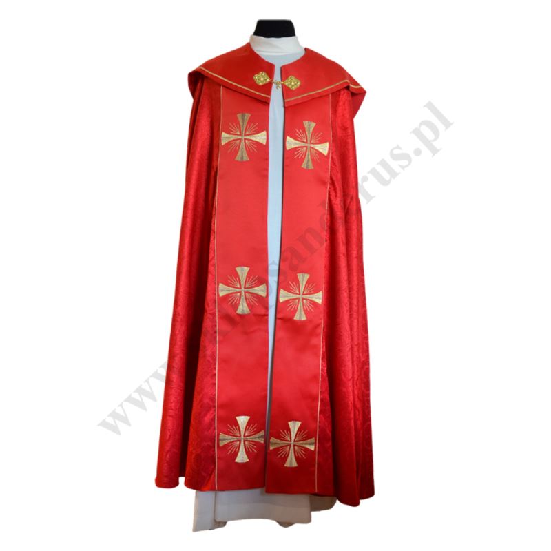 Kapa czerwona wykonana z materiału zawierającego 55% poliester i 45% bawełny. Długość kapy 140 cm.