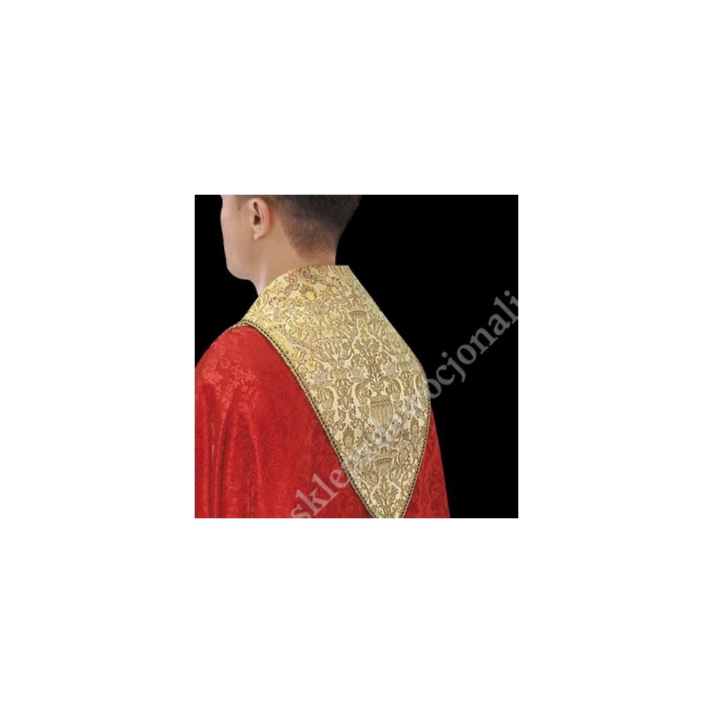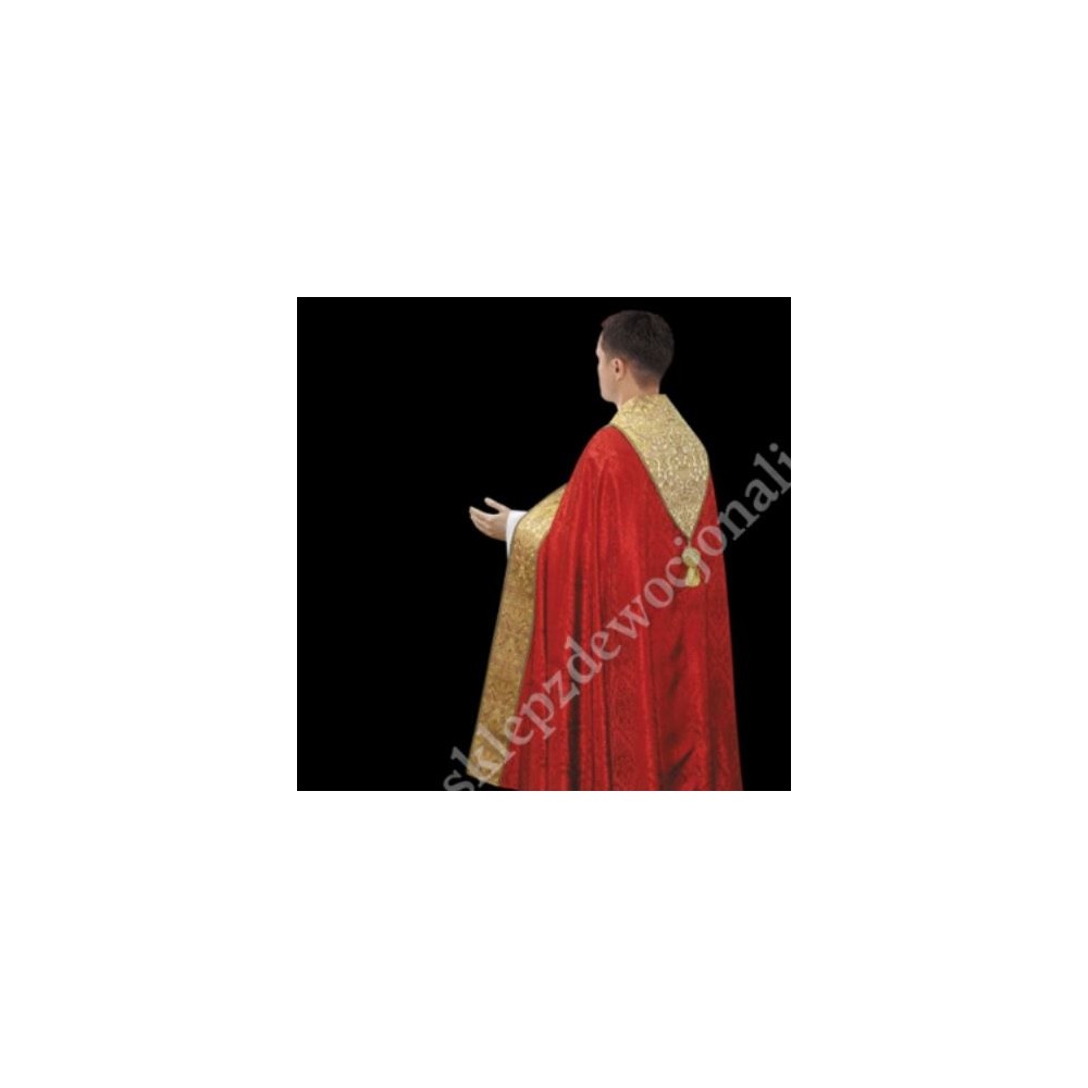 Kapa uszyta z ozdobnej tkaniny typu adamaszek, kaptur i pasy wykonane z ozdobnego włoskiego brokatu. Kapa ozdobiona złotą tasiemką i klamrą.