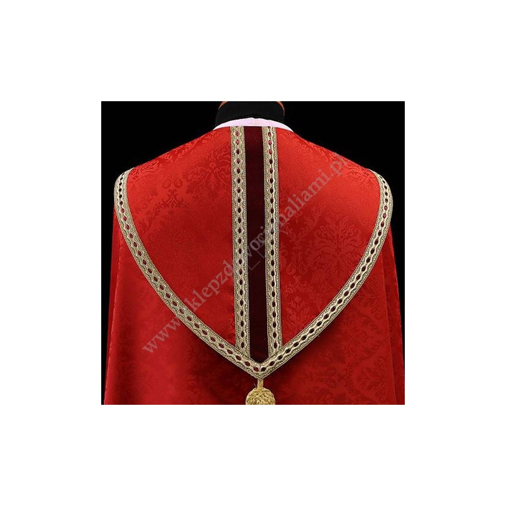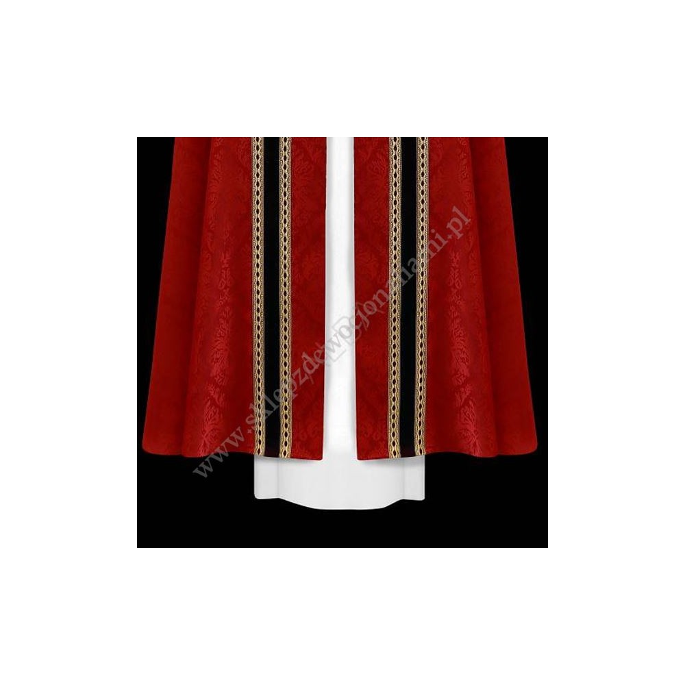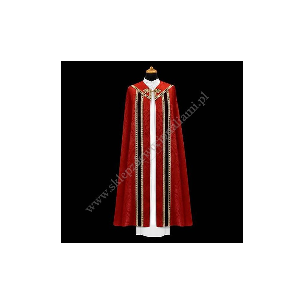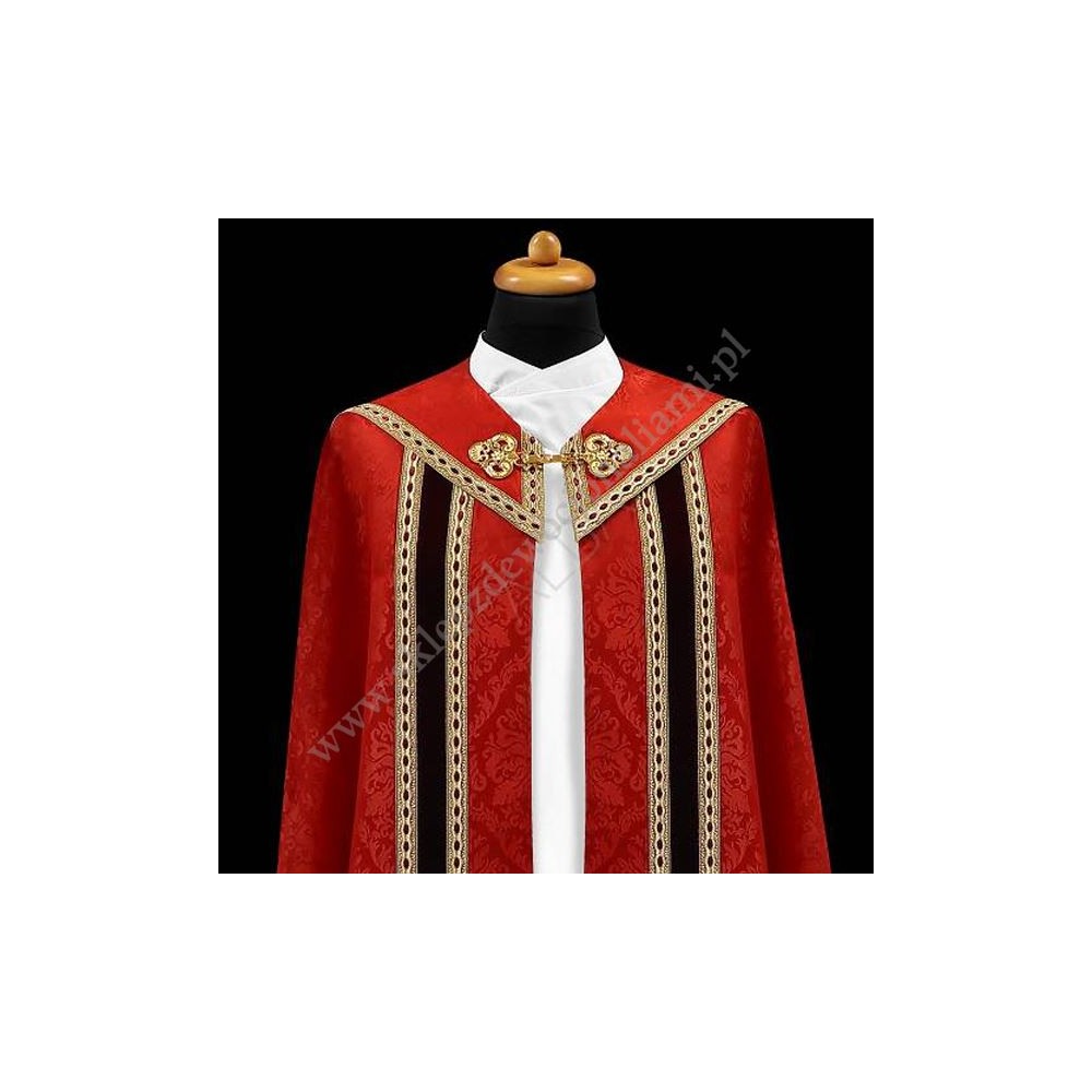 Elegancka kapa ze stułą wewnętrzną, uszyta z kremowej lekkiej tkaniny typu adamaszek. Kapa ozdobiona pasem z aksamitu i złotą pasmanterią oraz złotą kutą klamrą.