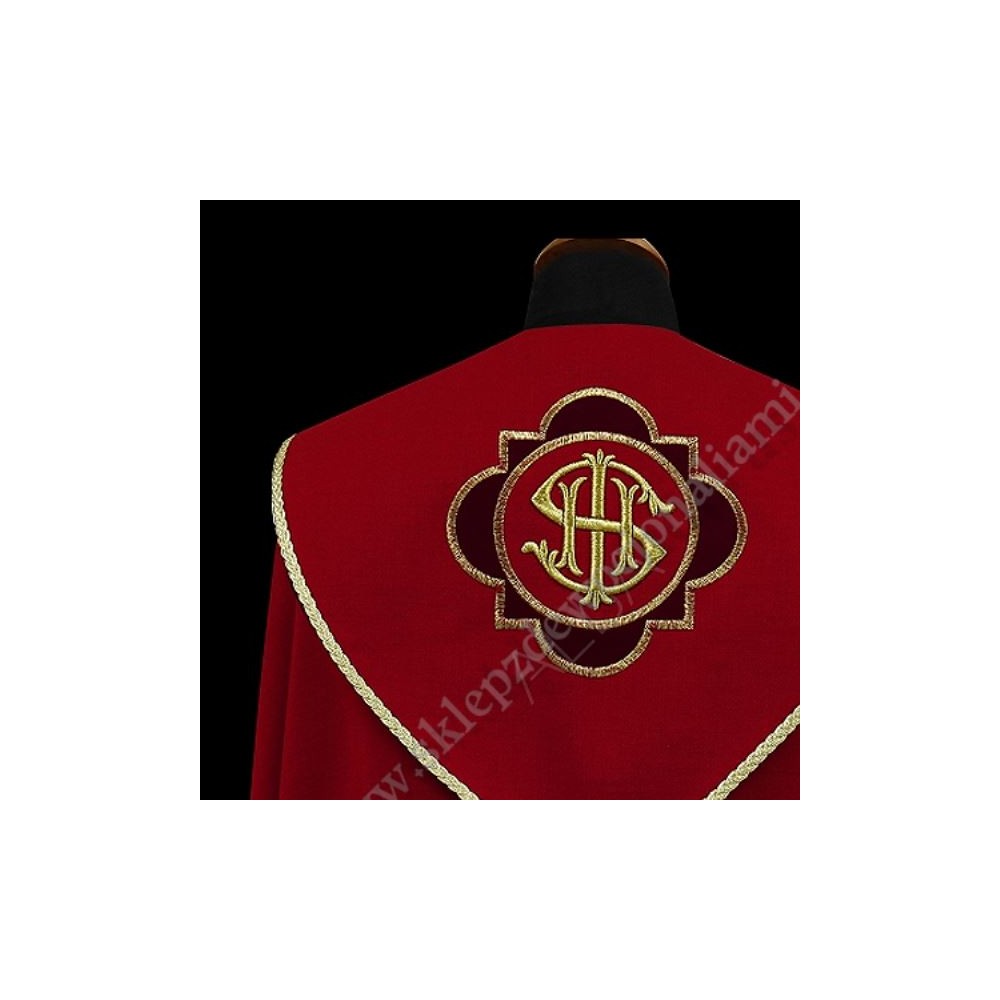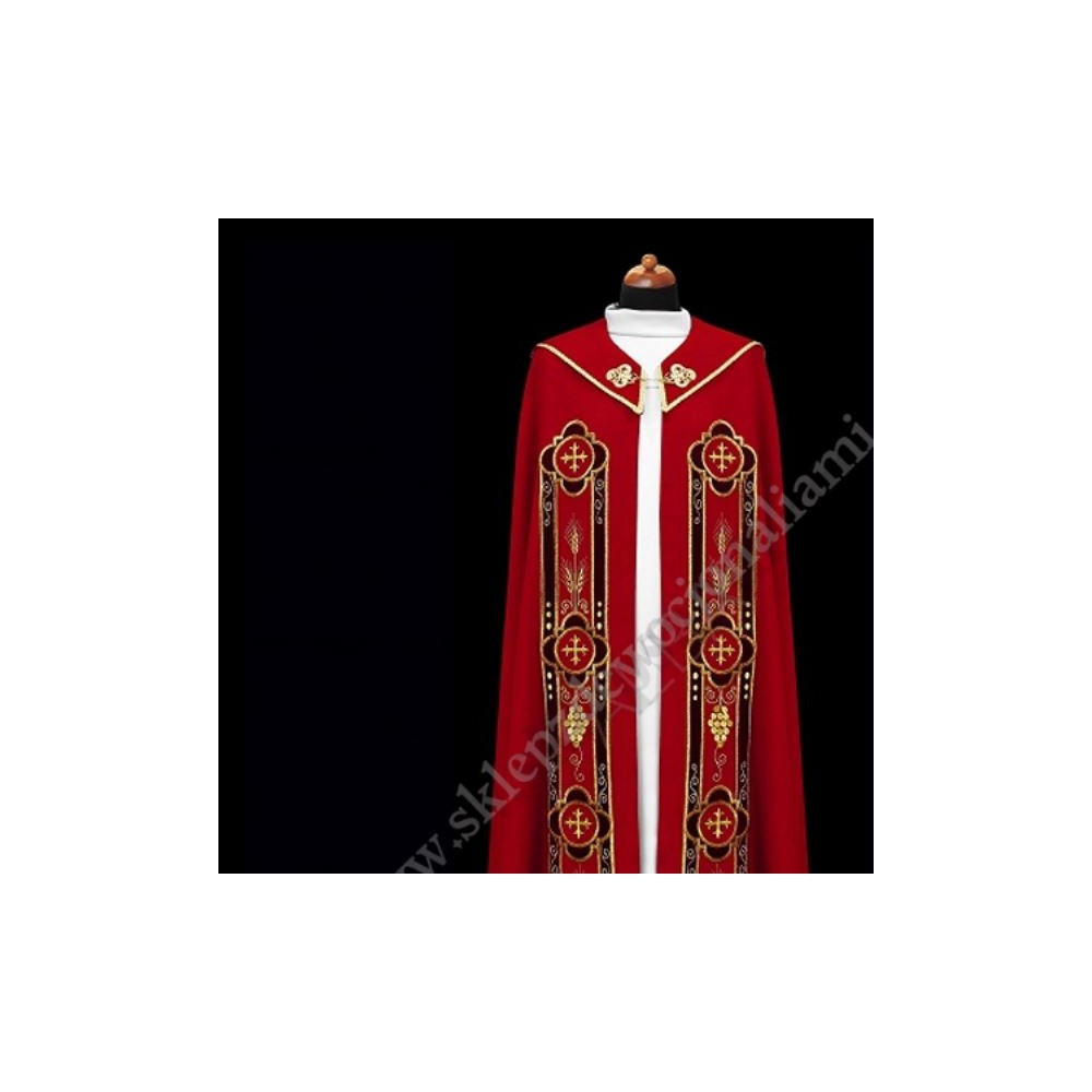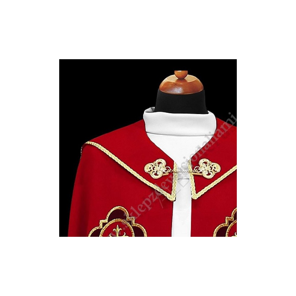 Elegancka kapa ozdobiona haftowanymi aplikacjami z bordowego aksamitu. Na kapturze ozdobna aplikacja hatowana, całość wykończona ozdobnymi tasiemkami i złota kutą klamrą.