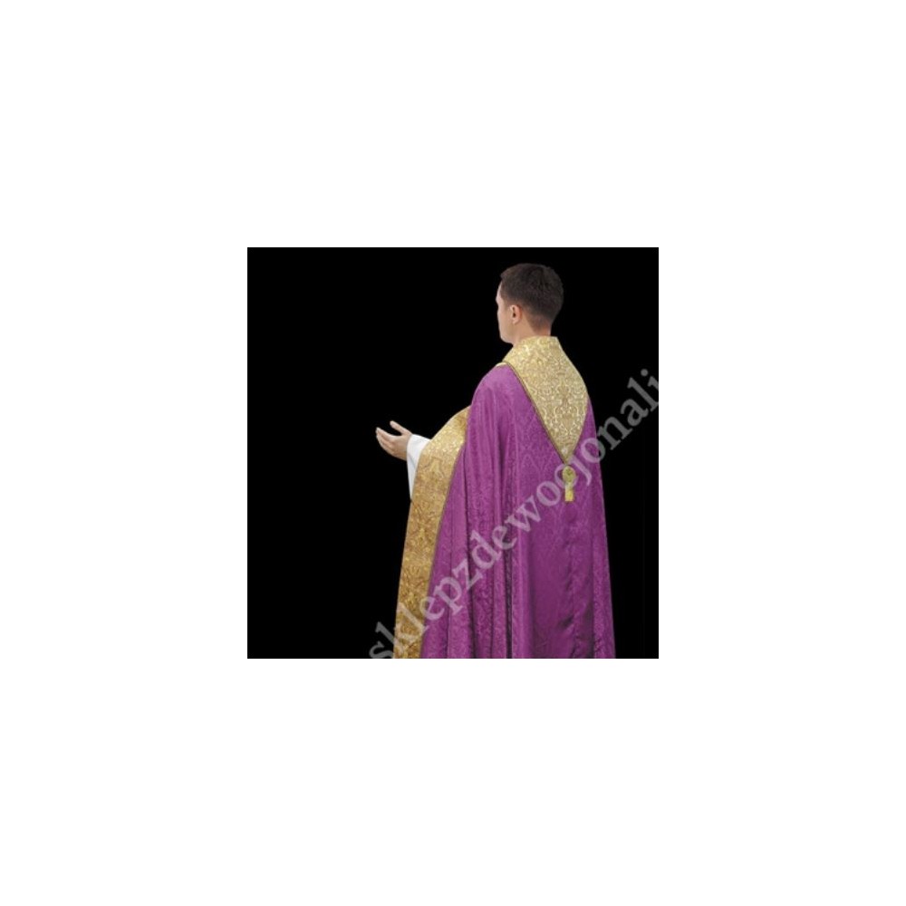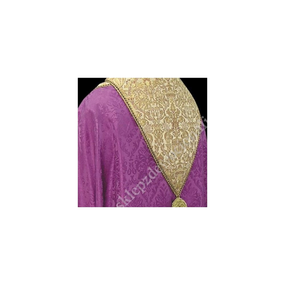 Kapa fioletowa uszyta z ozdobnej tkaniny typu adamaszek, kaptur i pasy wykonane z ozdobnego włoskiego brokatu. Kapa ozdobiona złotą tasiemką i klamrą.