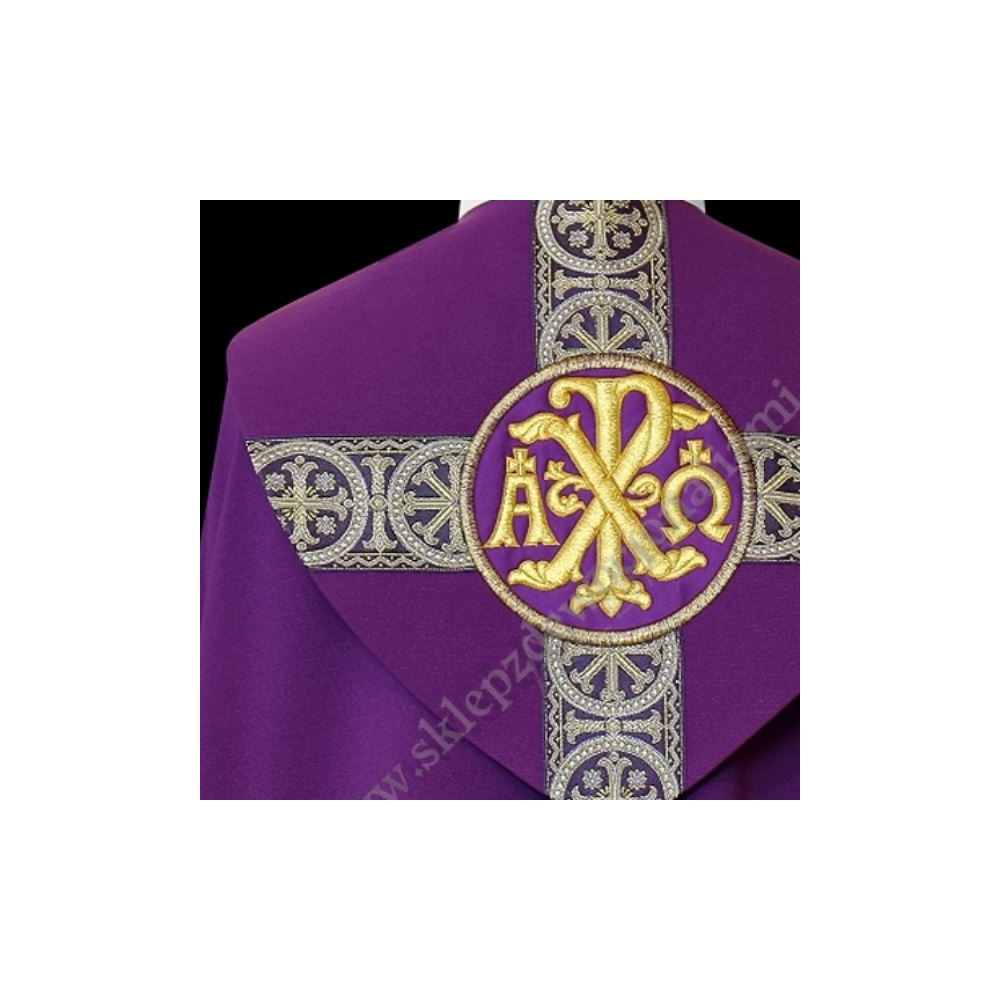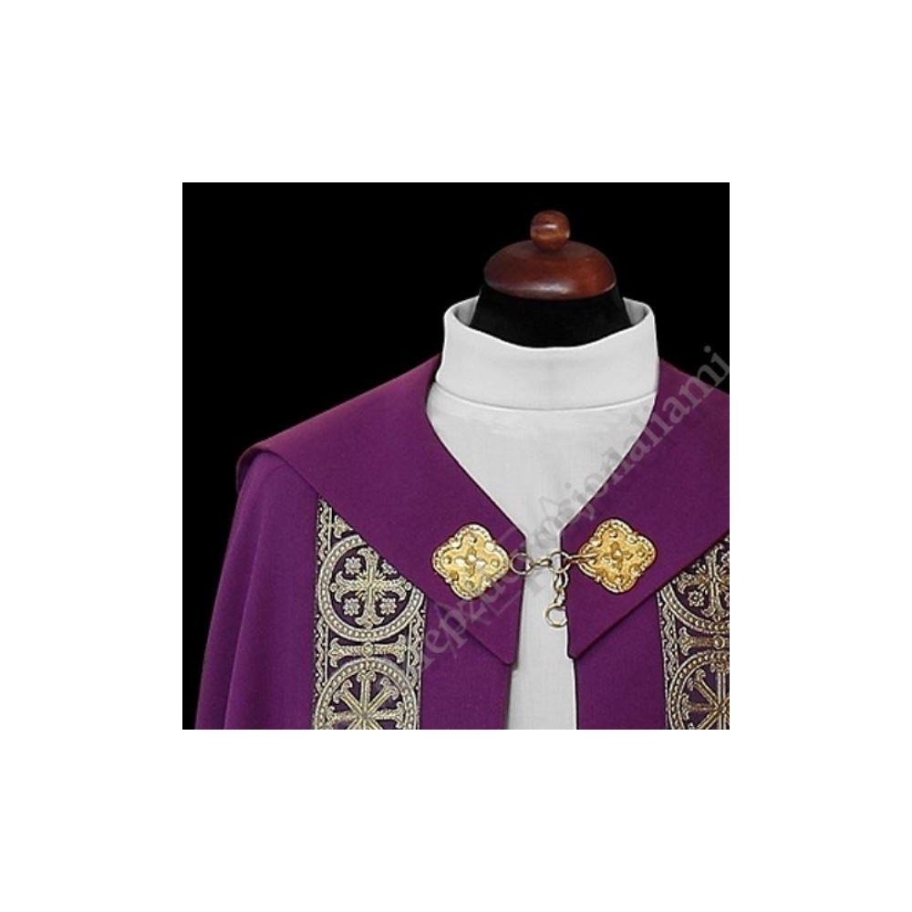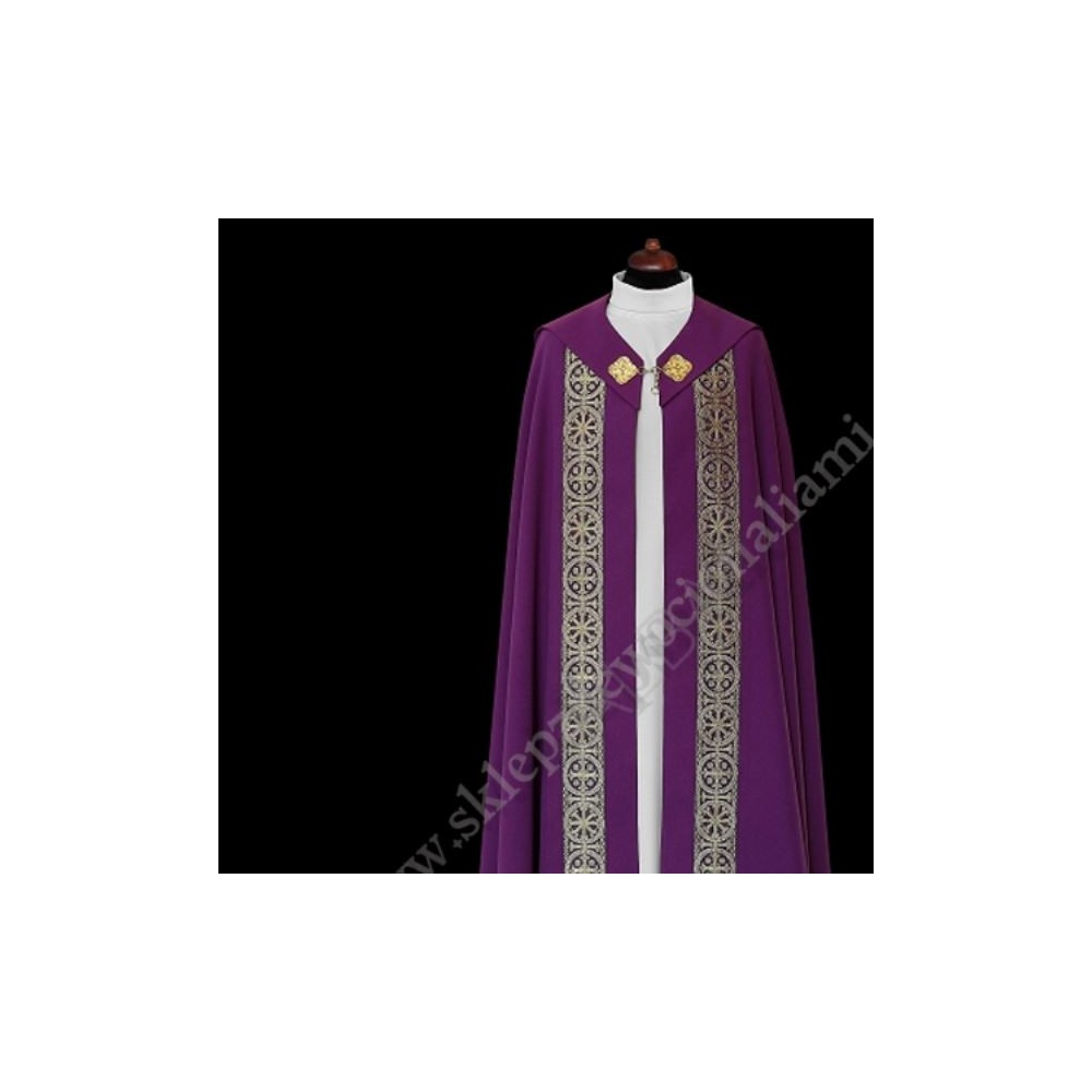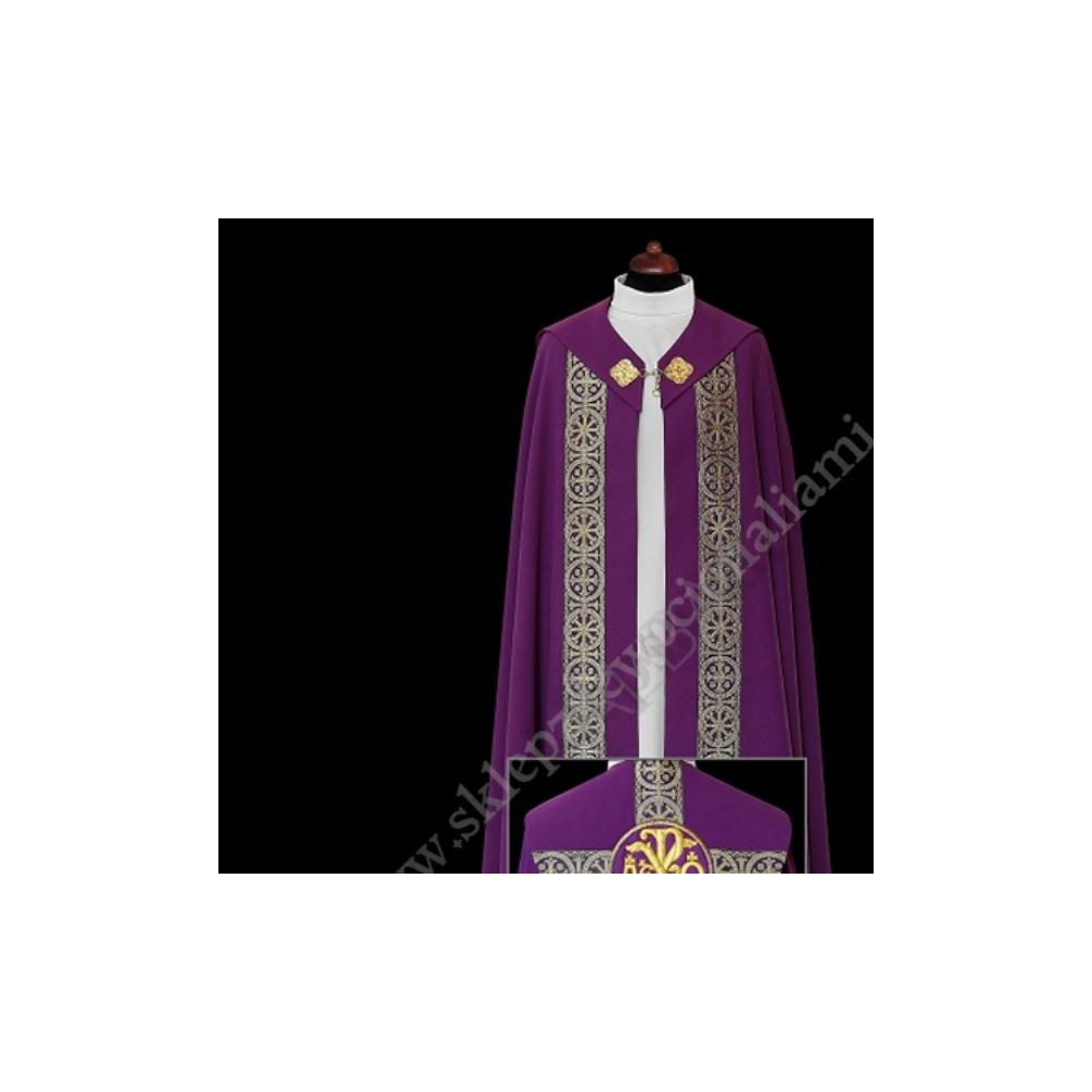 Kapa ozdobiona złotym galonem i haftowaną aplikacją na kapturze, wykończona kutą, złotą klamrą.