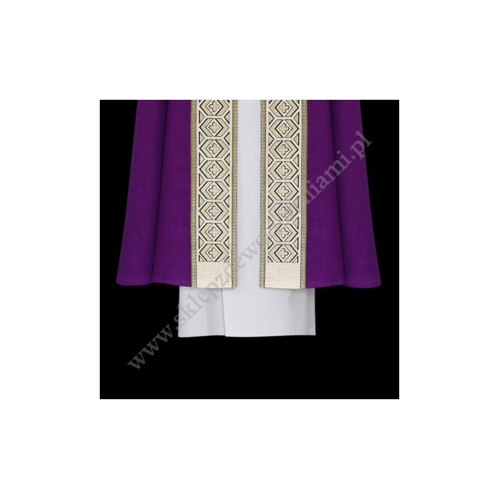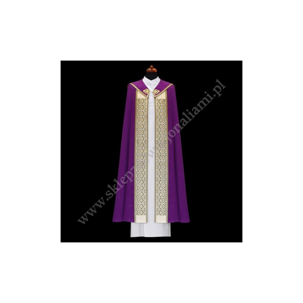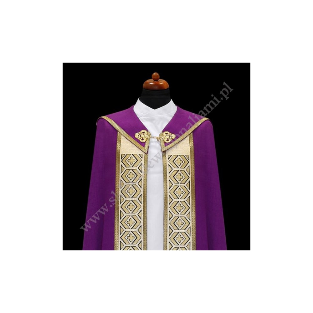 Bogato haftowana kapa ze stułą wewnętrzną uszyta z lekkiej tkaniny. Pasy wykończone złotą pasmanterią, kaptur haftowany.