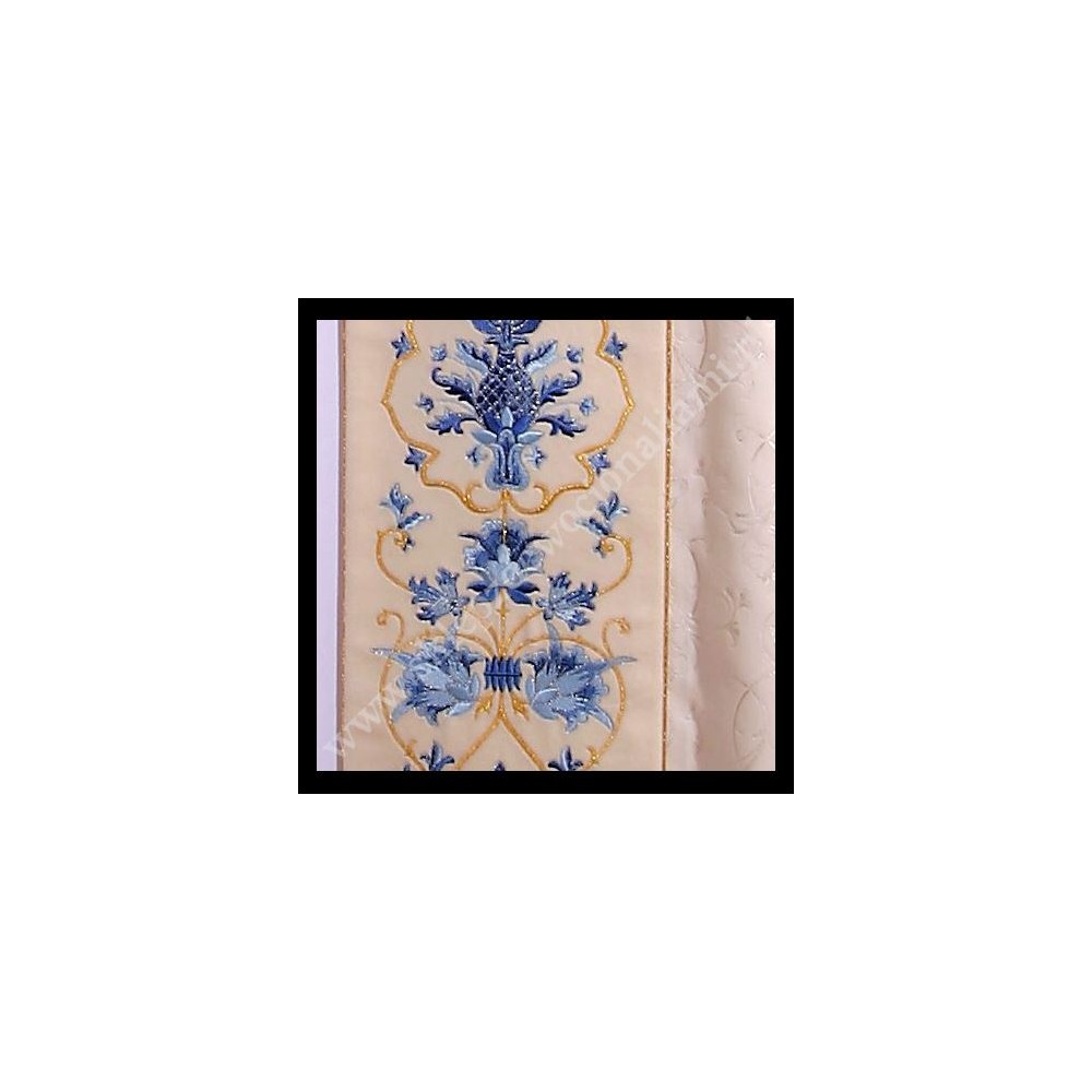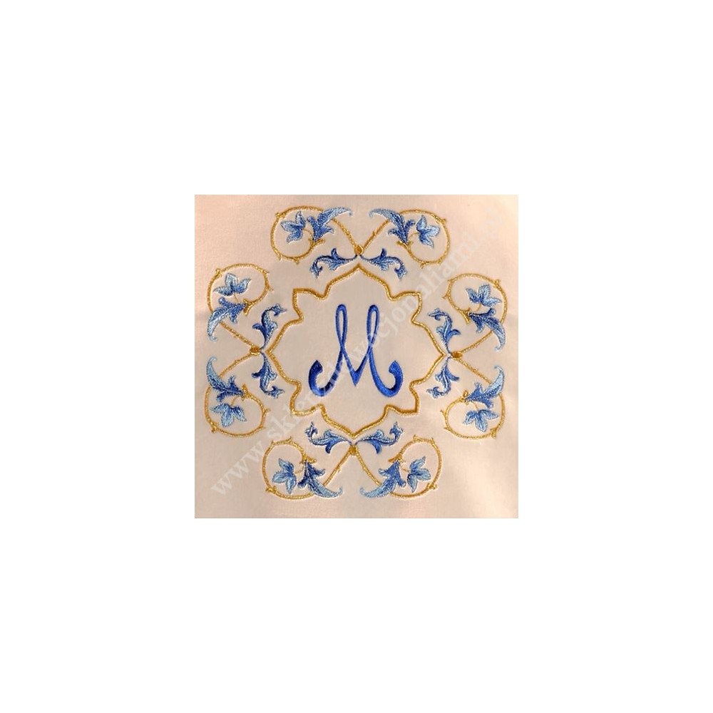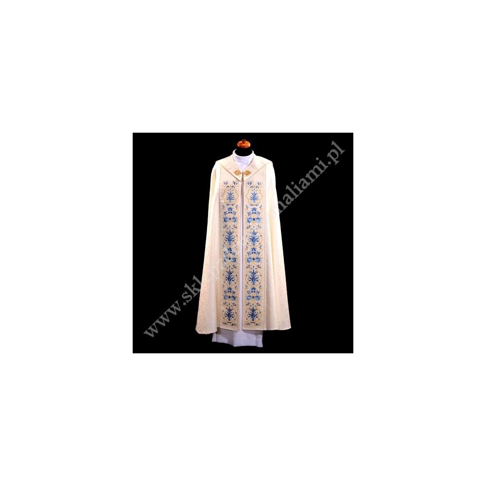 Kapa Maryjna z bogatym haftowanym pasem aksamitnym. Całość wykonana z ozdobnej tkaniny z kutą, złotą klamrą.
