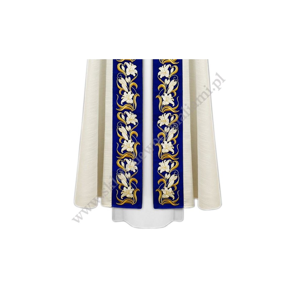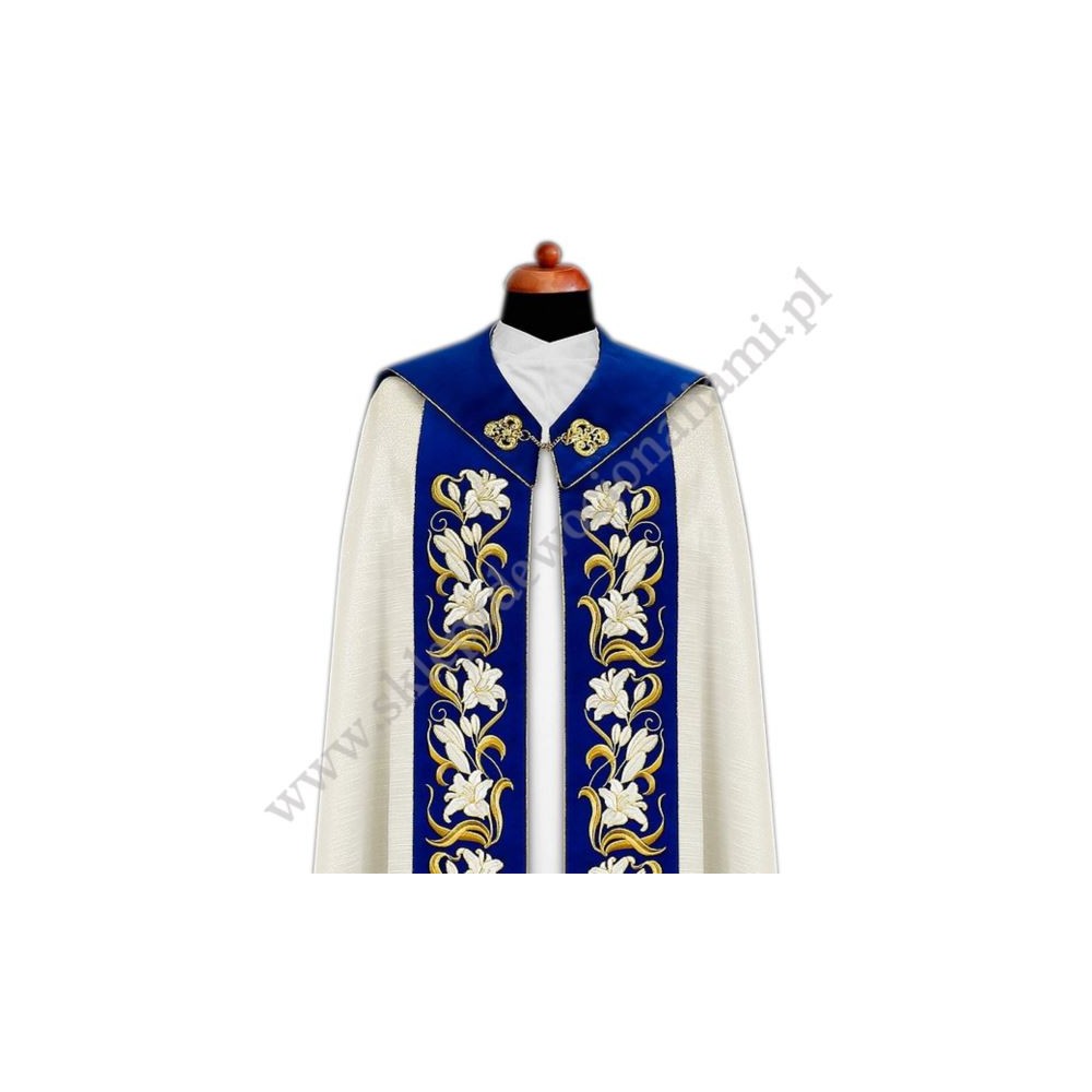 Kapa kremowa Maryjna uszyta z lekkiej tkaniny ze srebrną nicią, ozdobiona aksamitnym haftowanym pasem.