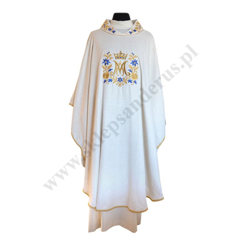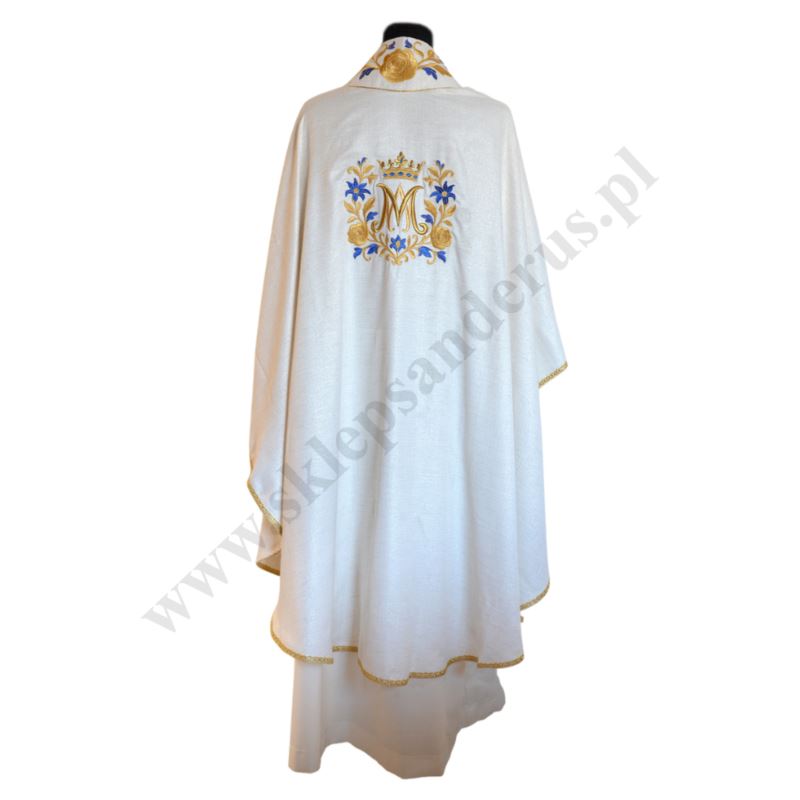 Ornat maryjny zdobiony haftem z emblematem maryjnym i motywami florystycznymi, wykonany z materiału typu len.
