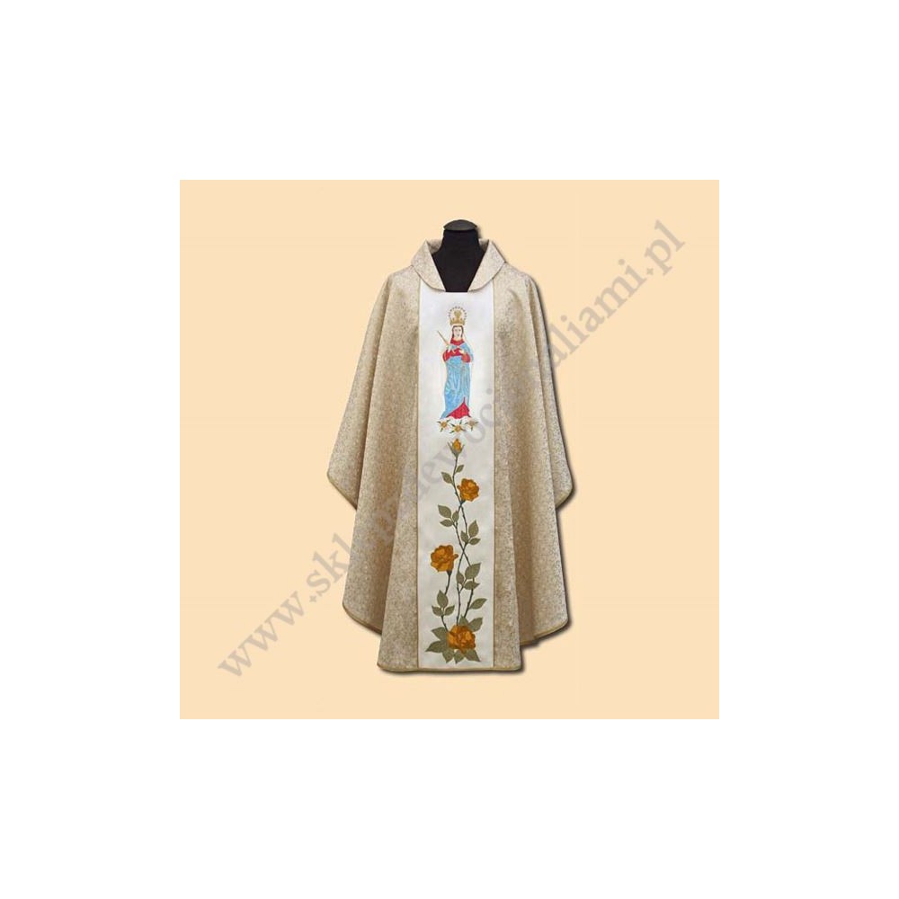 Ornat z materiału imitującego złoto, pas haftowany motywami maryjnymi, na pasie wyhaftowany jest również wizerunek Matki Bożej