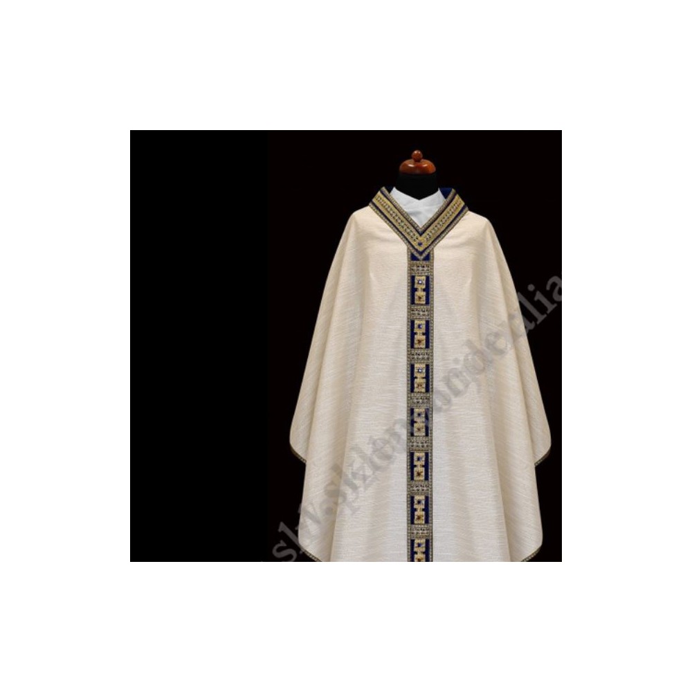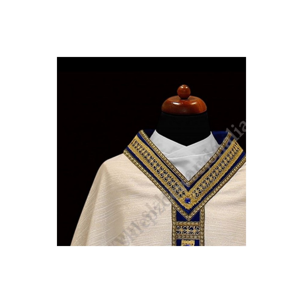 Krój: ornat z ozdobnym kołnierzem wykończony kamieniem