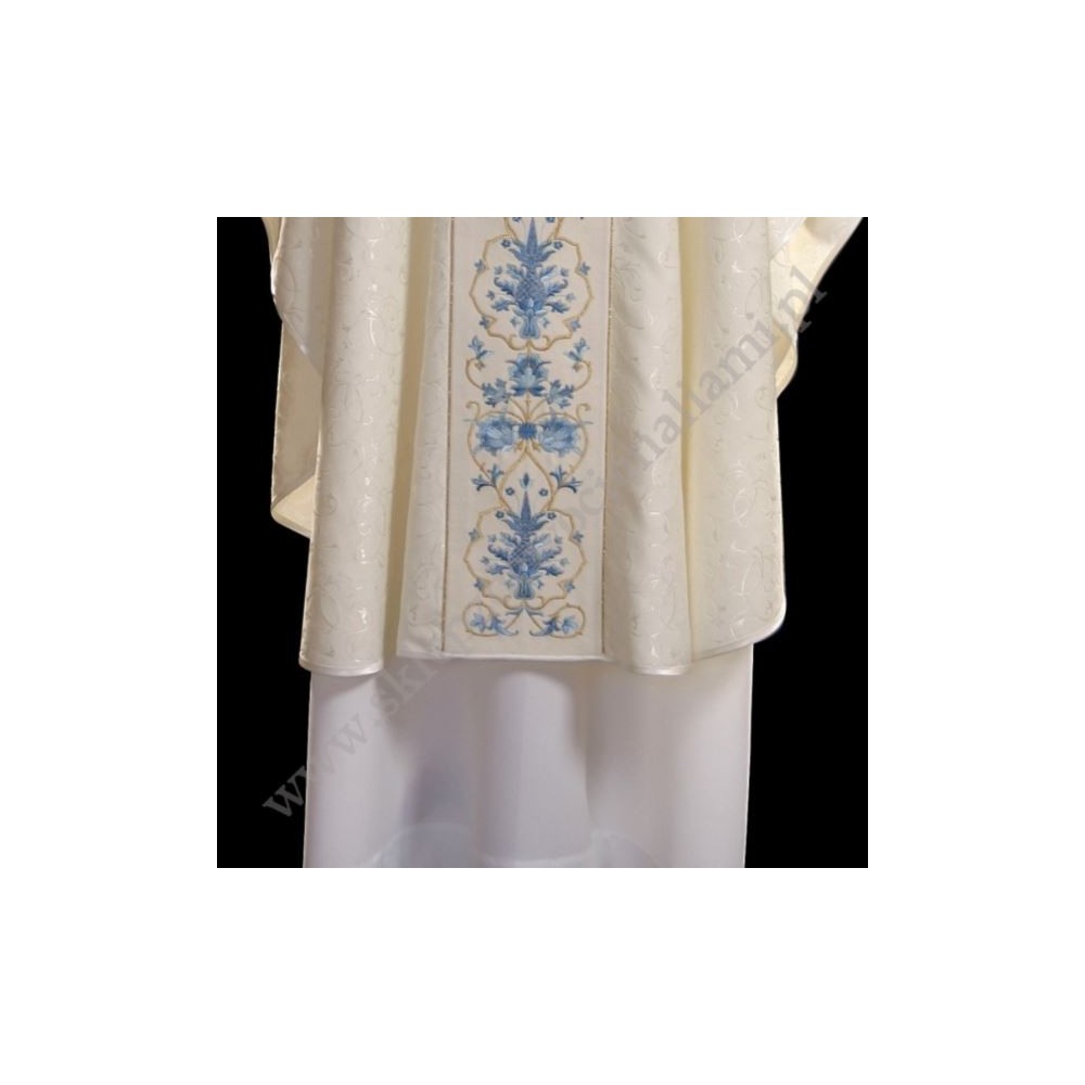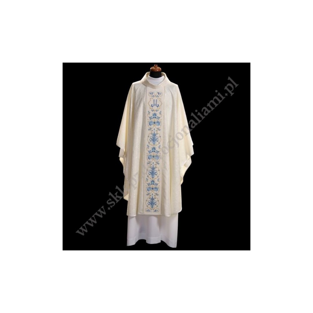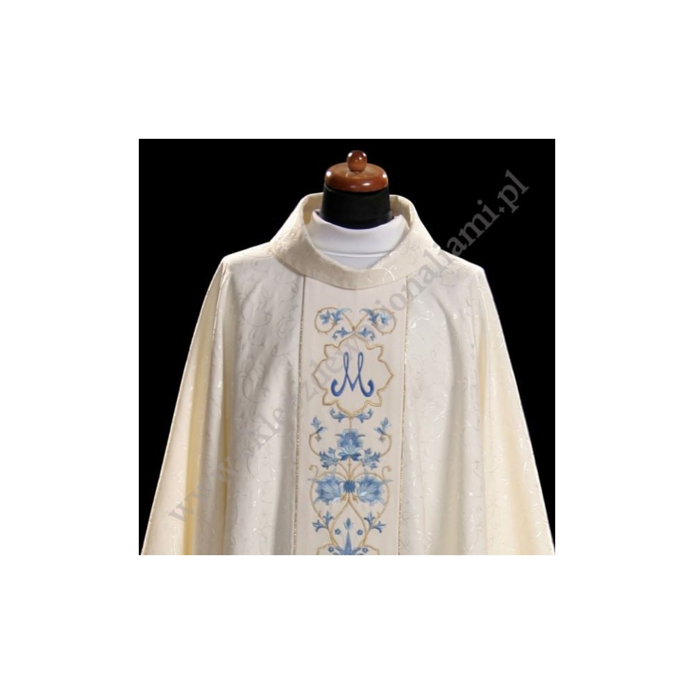 Ornat Maryjny uszyty z ozdobnej tkaniny, z pięknym bogatym haftem, wykonanym na aksamitnym pasie