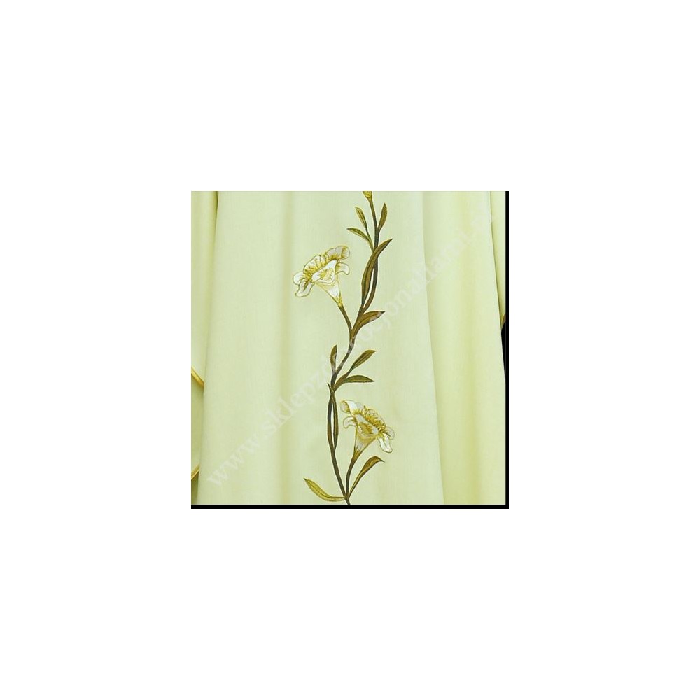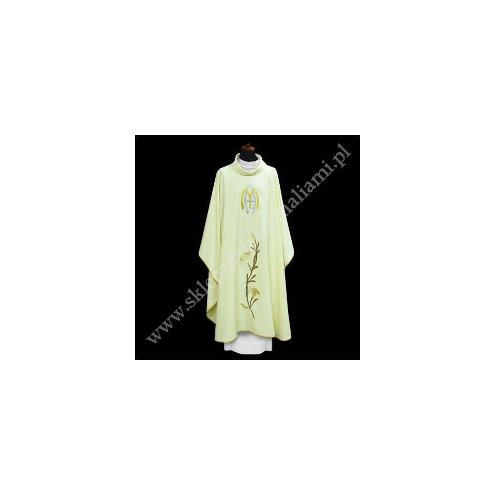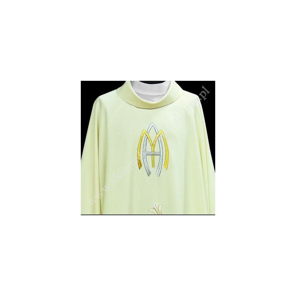 Ornat Maryjny z haftowanym monogramem i lilią. Szata liturgiczna uszyta w stylu monastycznym ze stułą wewnętrzną.