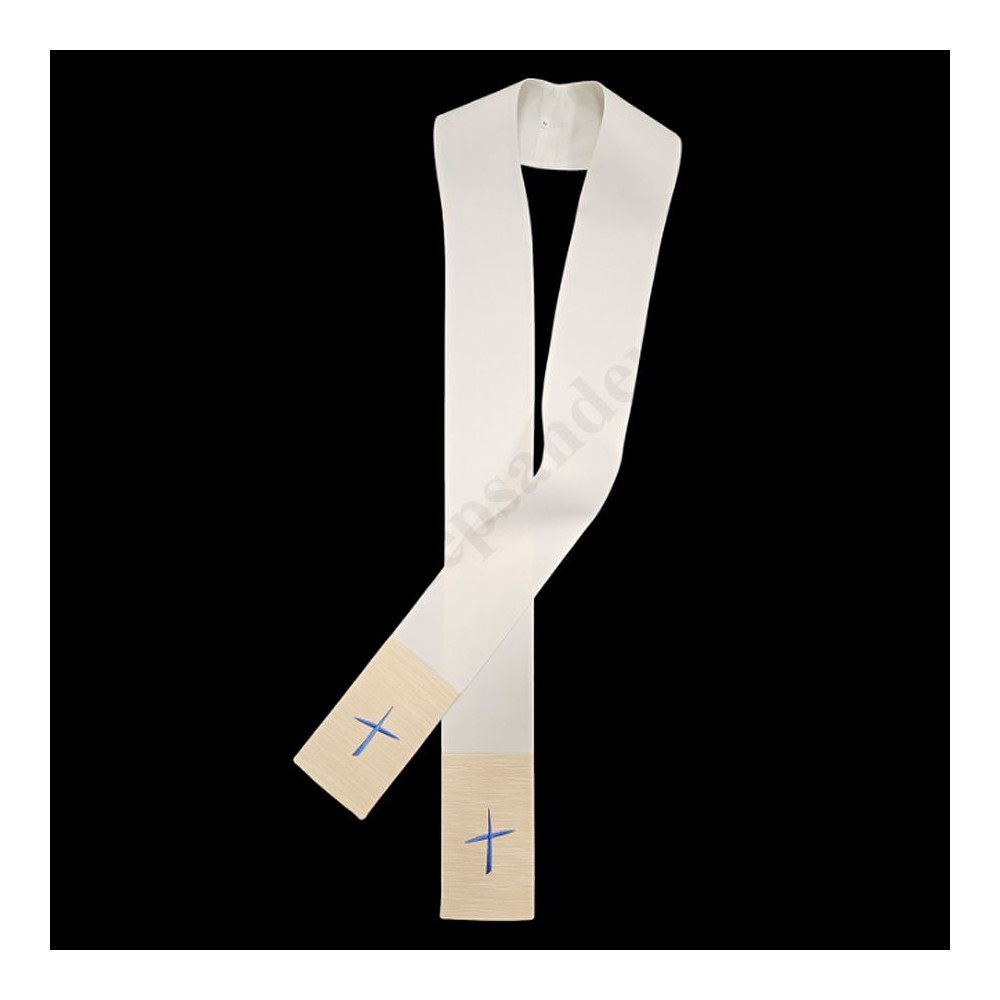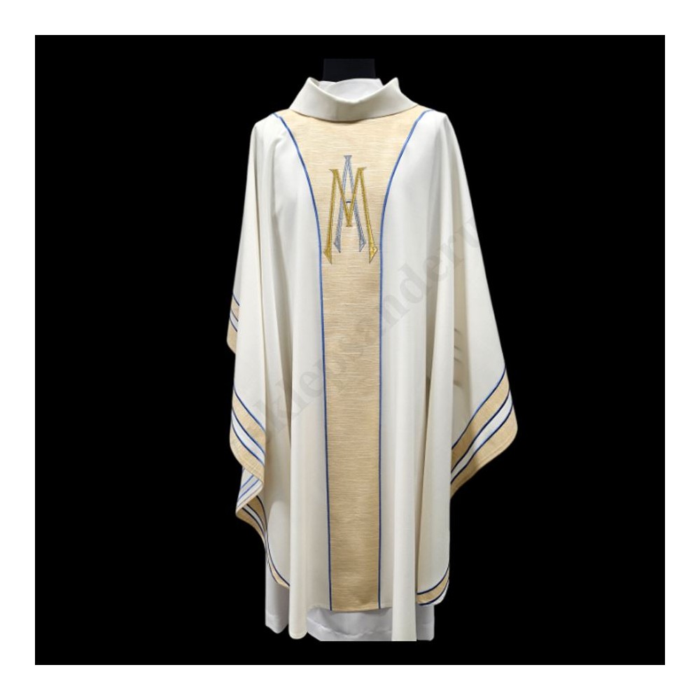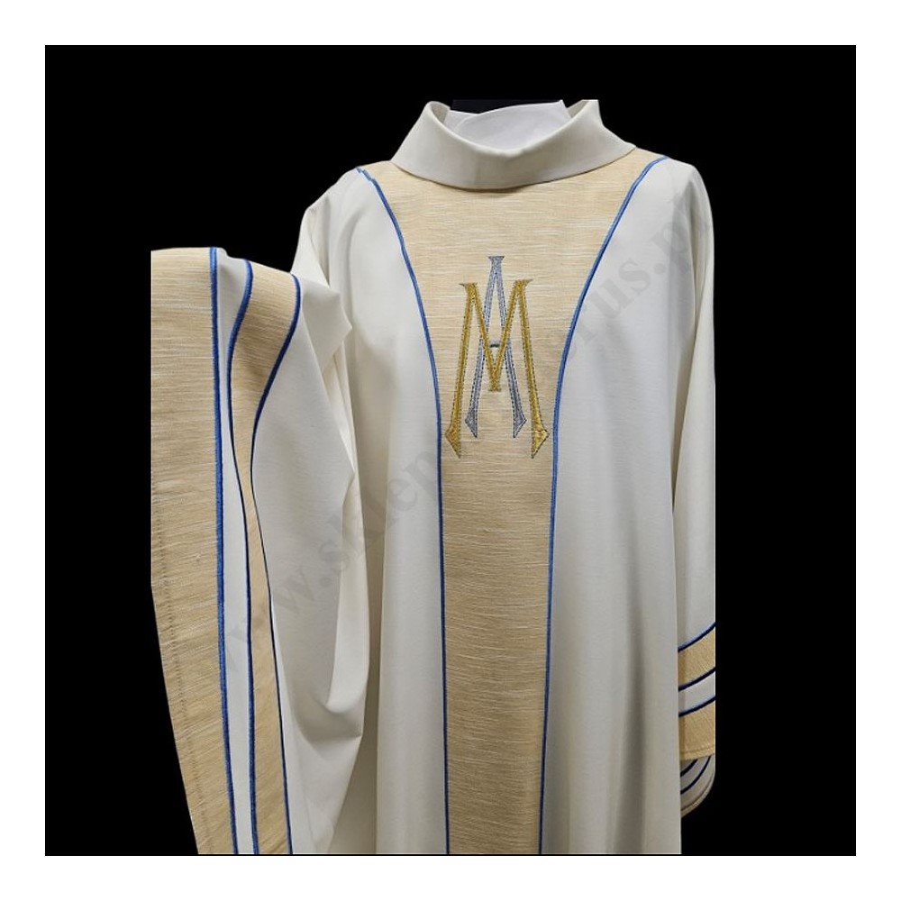 Elegancka szata liturgiczna wyprodukowana z lekkiej wełnianej tkaniny, zdobiona mistycznymi aplikacjami z czystej wełny. Haftowany symbol Maryjny dodają uroku i symbolicznego znaczenia.