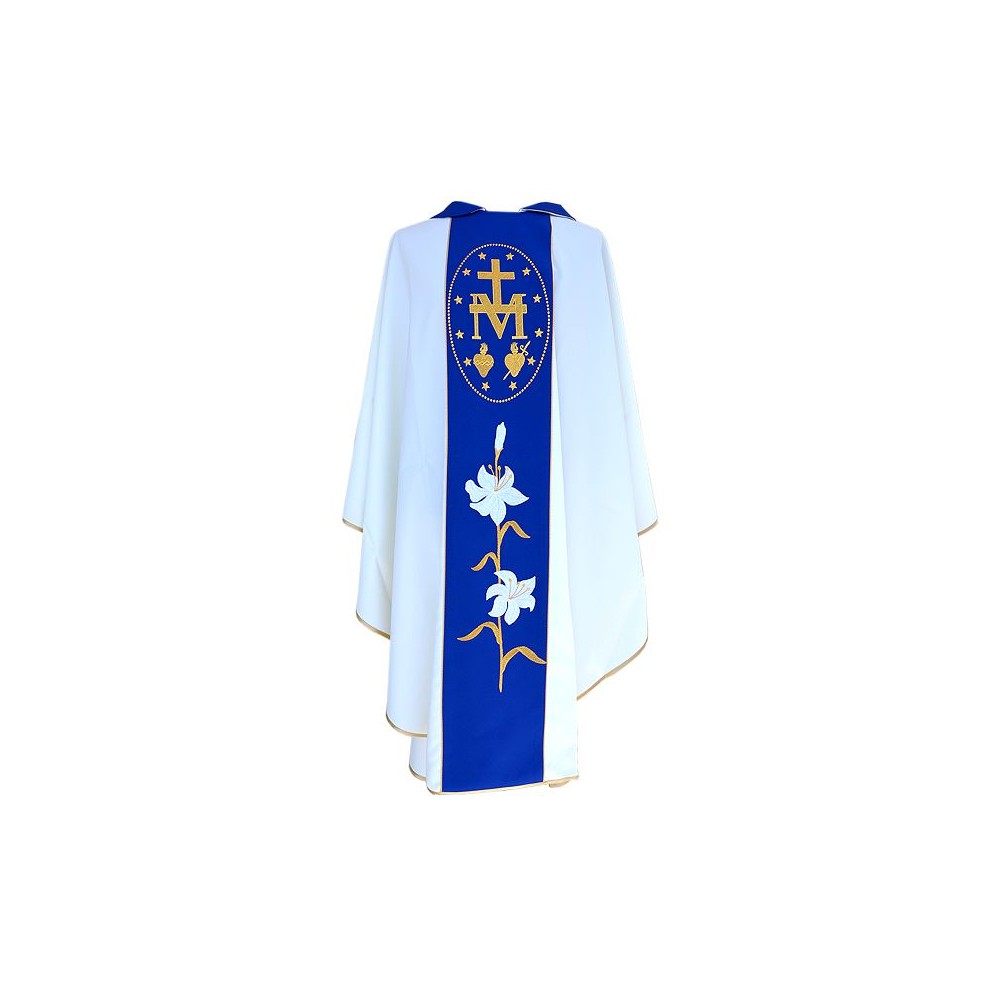 Ornat wykonany z wysokiej jakości tkaniny haftowany komputerowo motywami maryjnymi.