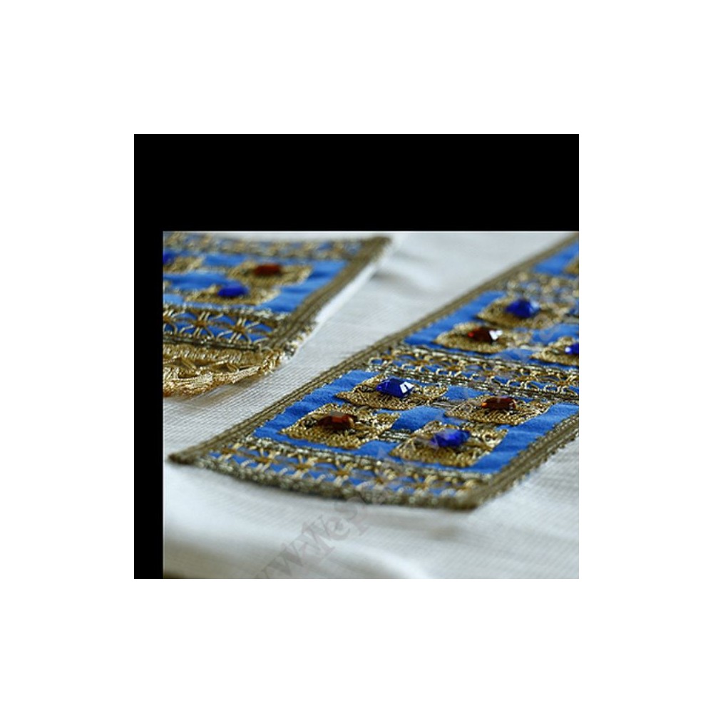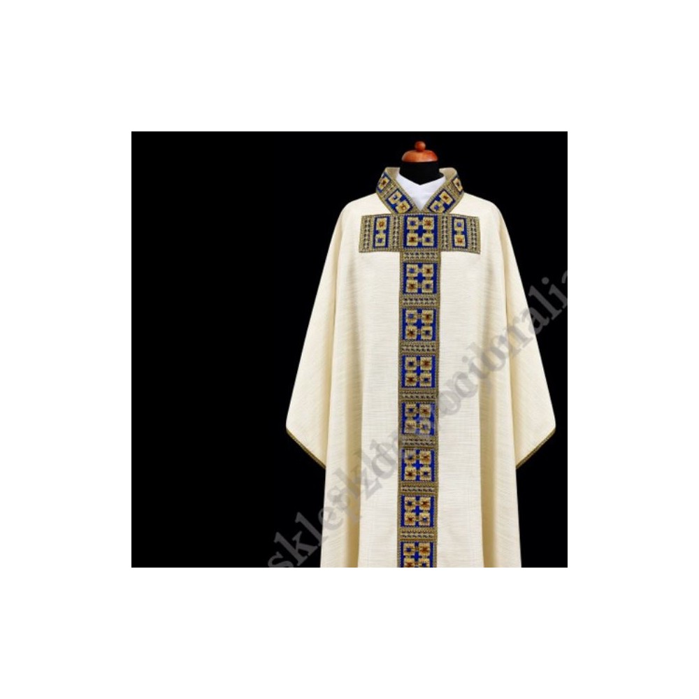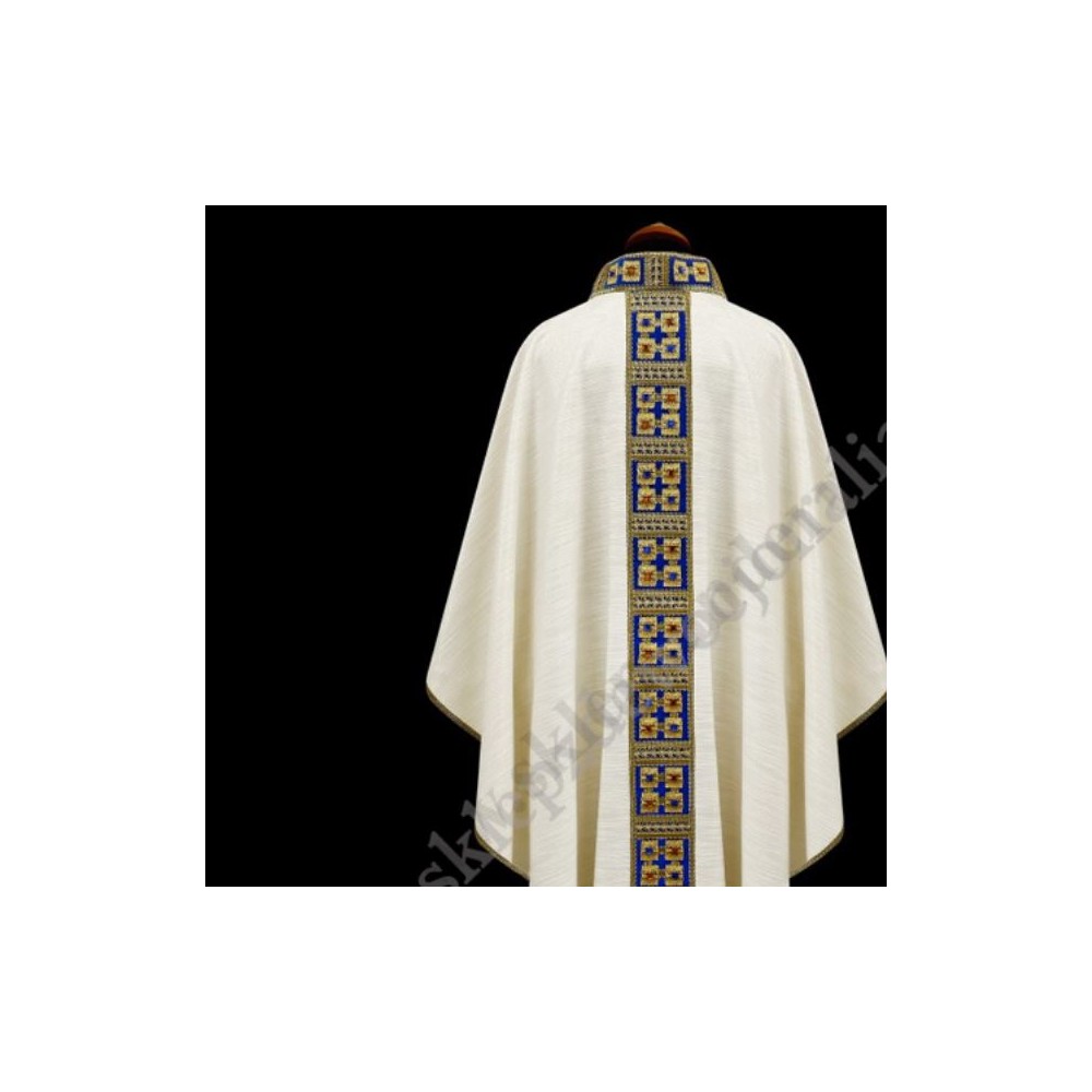 Ornat maryjny uszyty z ozdobnej tkaniny, z ręcznie naszywanymi ozdobami z taśm i kamieni na aksamicie. Stuła do ornatu również z bogatymi zdobieniami.