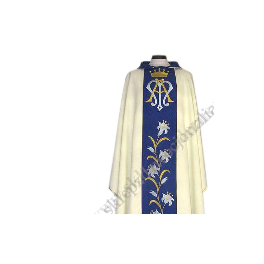 Ornat maryjny z pasem haftowanym. Wykonany z lekkiego i przyjemnego w dotyku materiału. W komplecie stuła wewnętrzna.