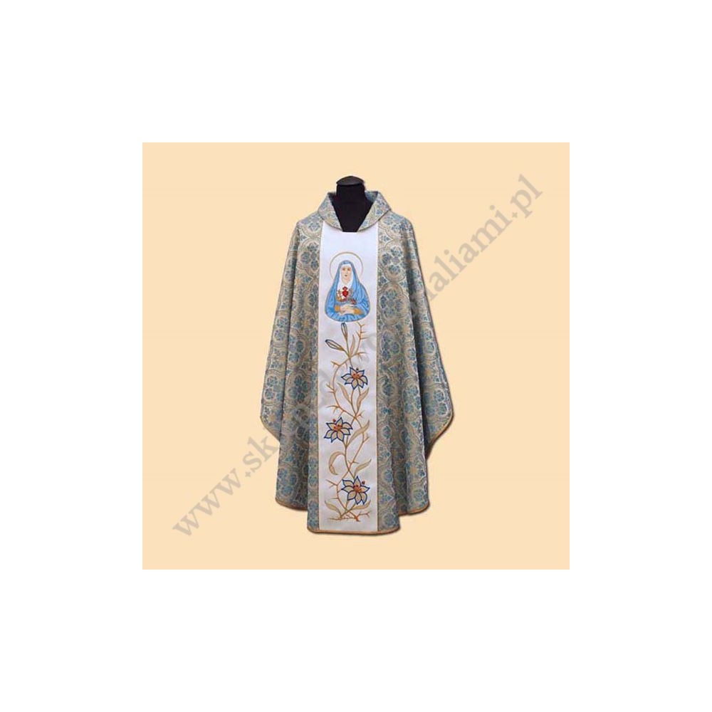 Ornat z materiału imitującego złoto, pas haftowany motywami maryjnymi, na pasie wyhaftowany jest również wizerunek Matki Bożej Bolesnej