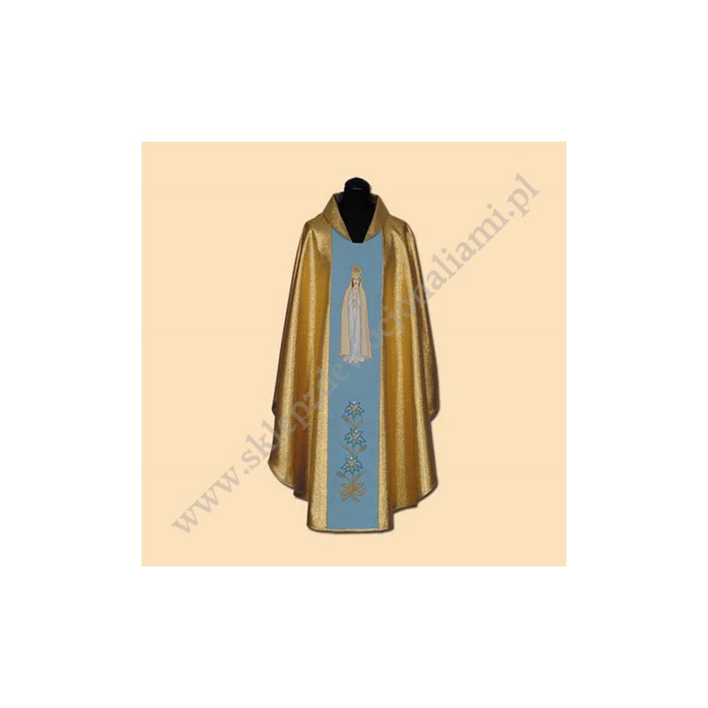 Ornat z materiału imitującego złoto, pas haftowany motywami maryjnymi, na pasie wyhaftowany jest również wizerunek Matki Bożej Fatimskiej
