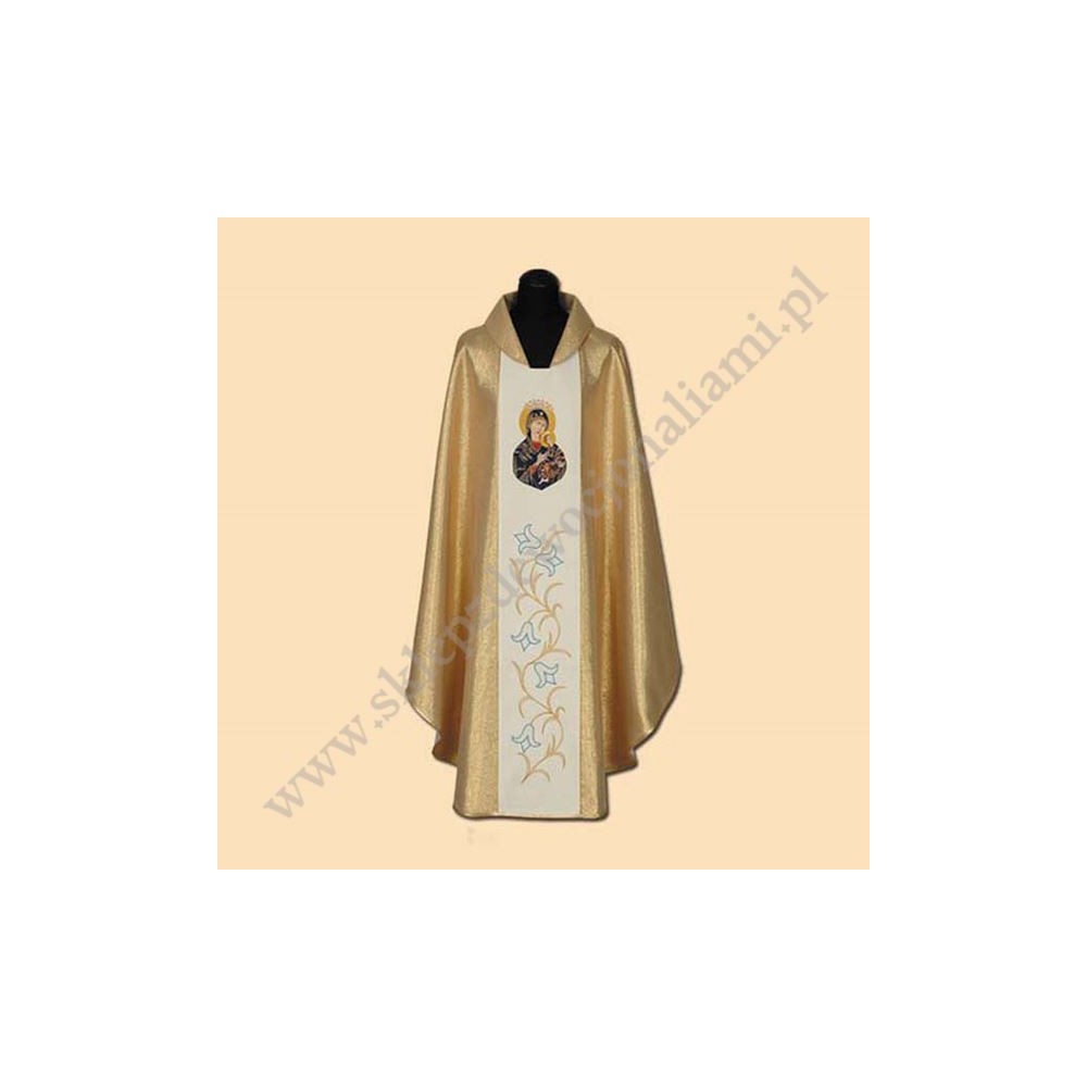 Ornat z materiału imitującego złoto, pas haftowany motywami maryjnymi, na pasie wyhaftowany jest również wizerunek Matki Bożej Nieustającej Pomocy