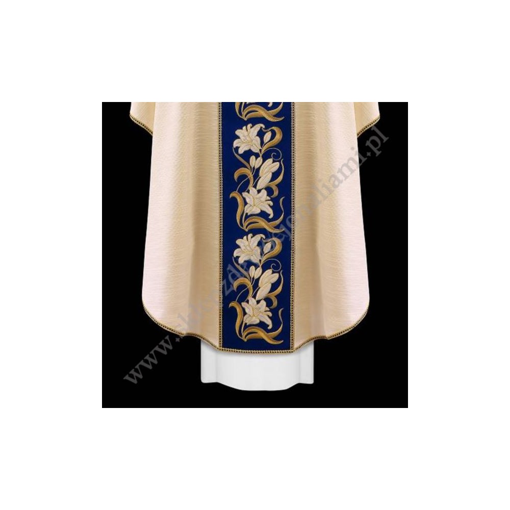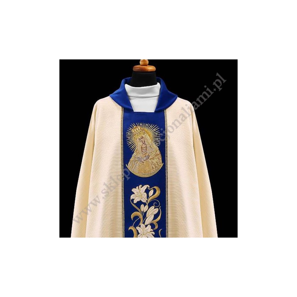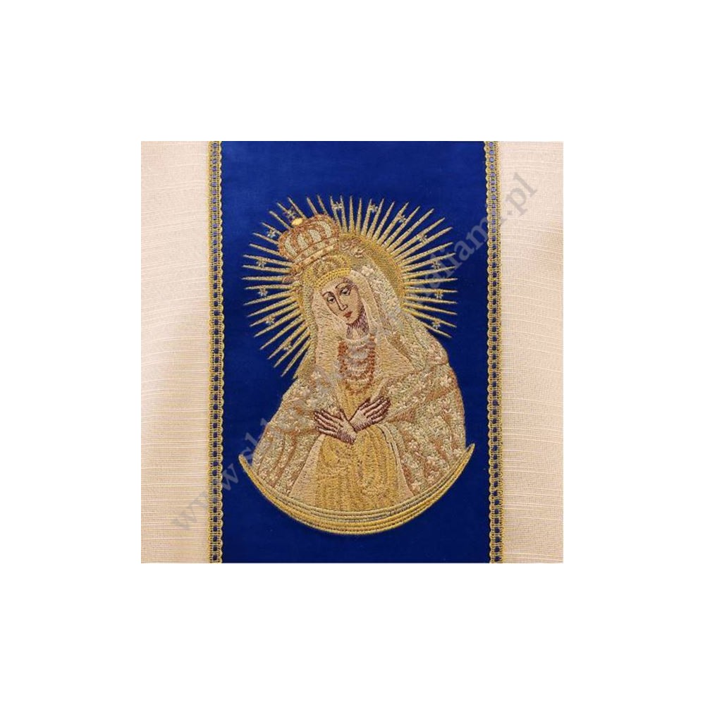 Ornat maryjny haftowany uszyty z lekkiej tkaniny ze srebrną nicią z haftowanym wizerunkiem Matki Bożej Ostrobramskiej.