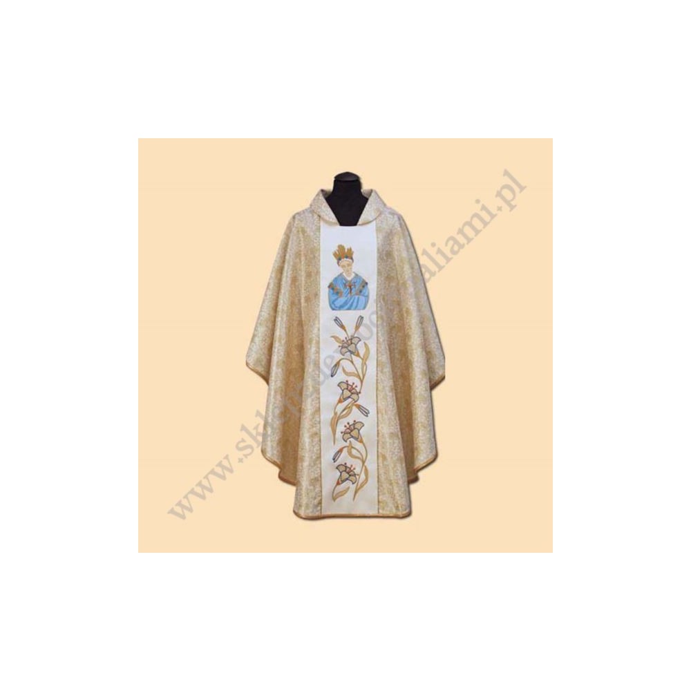 Ornat z materiału imitującego złoto, pas haftowany motywami maryjnymi, na pasie wyhaftowany jest również wizerunek Matki Bożej z La Salette