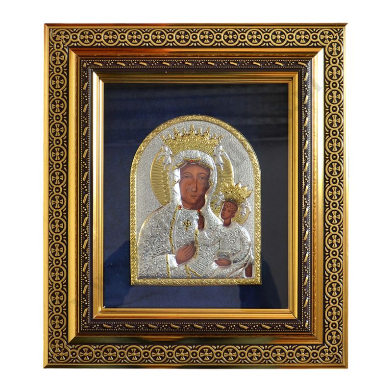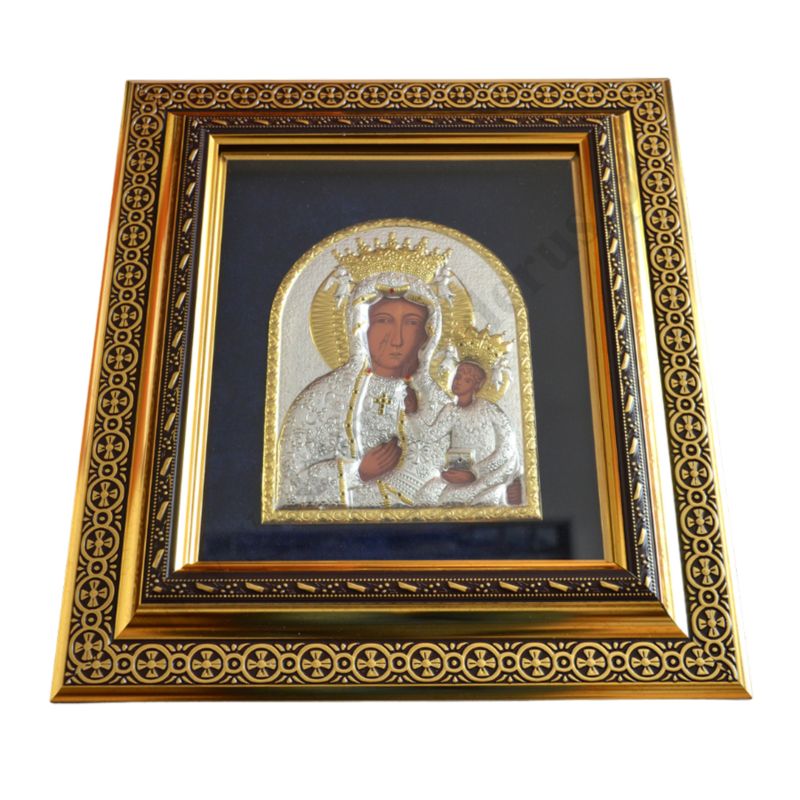 Ikona przedstawiająca Matkę Bożą Częstochowską wykonana techniką sitodruku w drewnie i płótnie, oprawiona wytłaczanym stopem PVD ze srebrem, pokrytym specjalnym lakierem ochronnym. Oprawiona w drewnianej ramce za szkłem. Ikona tylko do powieszenia. Szerokość 37.5 cm, wysokość 42.7 cm.