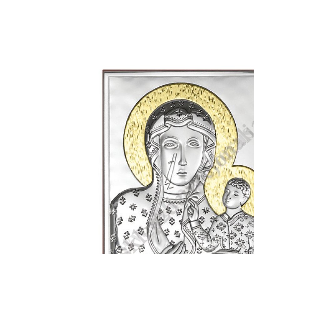 Srebrny obrazek przedstawiający wizerunek Matki Bożej Częstochowskiej wykonany z metalu dwuwarstwowego, aluminium i srebra. Zewnętrzna warstwa srebra o próbie 925 została pokryta dla zabezpieczenia warstwą lakieru. Rewers obrazka wykonany jest z eleganckiego drewna najwyższej jakości. Obrazek można powiesić na ścianie lub postawić na półce. Obrazek zapakowany jest w eleganckie kartonowe pudełko.