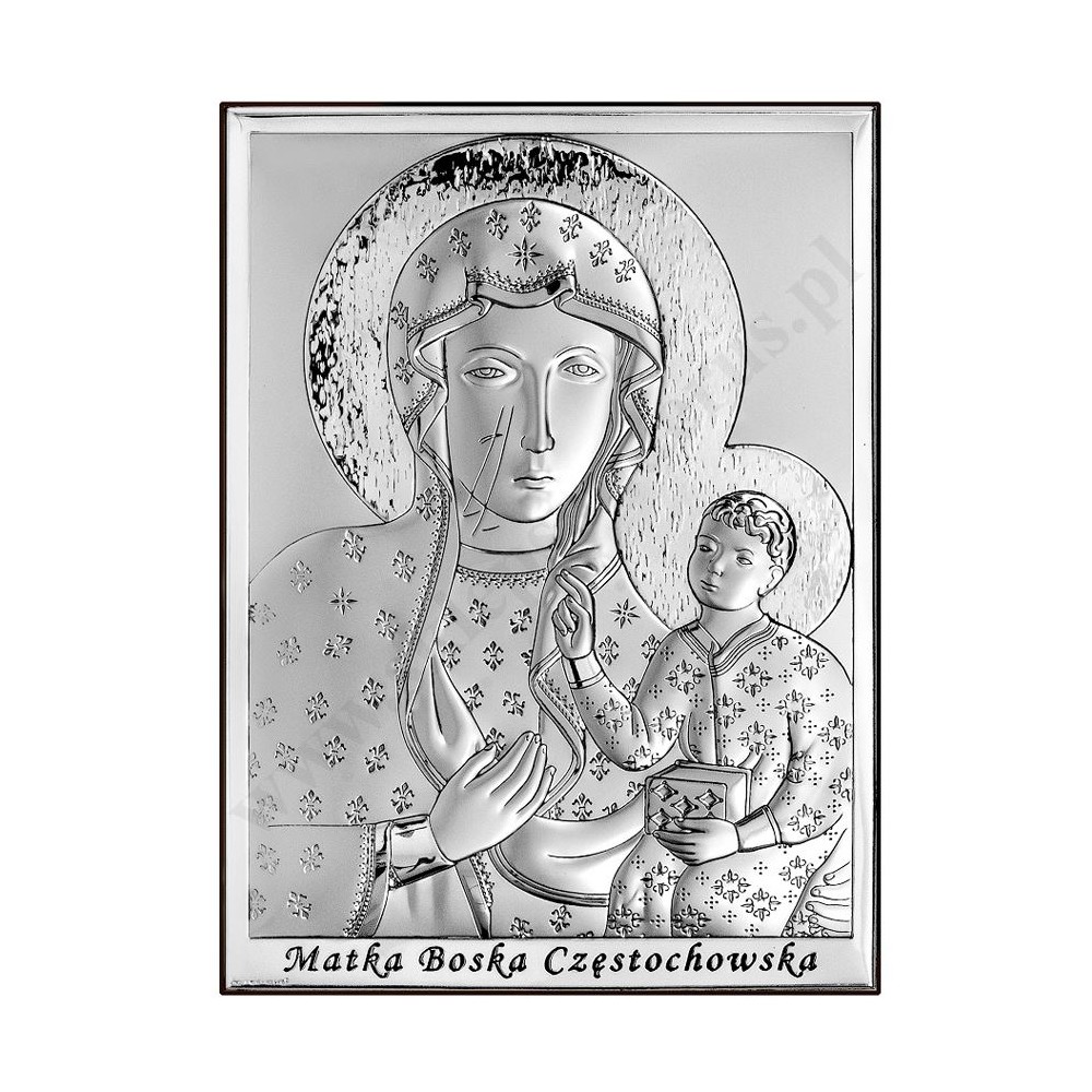 Srebrny obrazek przedstawiający wizerunek Matki Bożej Częstochowskiej wykonany z metalu dwuwarstwowego, aluminium i srebra. Zewnętrzna warstwa srebra o próbie 925 została pokryta dla zabezpieczenia warstwą lakieru. Rewers obrazka wykonany jest z eleganckiego drewna najwyższej jakości. Obrazek można powiesić na ścianie lub postawić na półce. Obrazek zapakowany jest w eleganckie kartonowe pudełko.