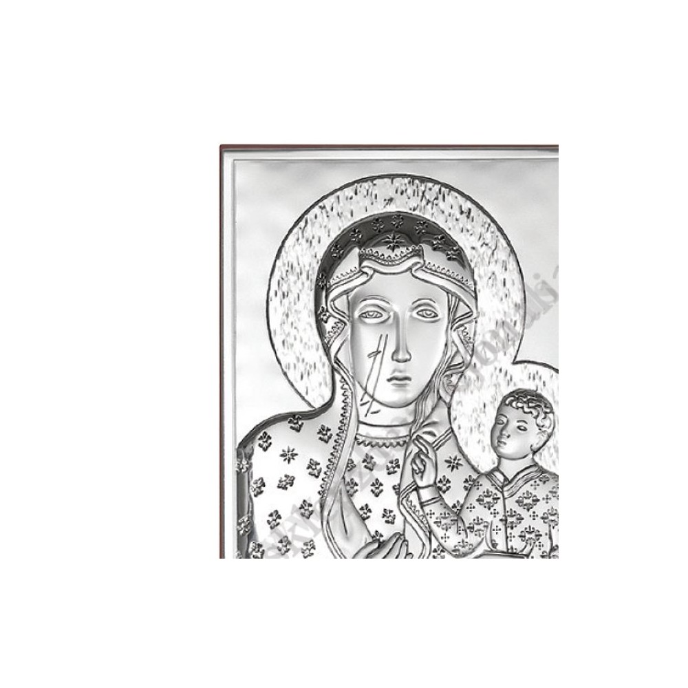 Srebrny obrazek przedstawiający wizerunek Matki Bożej Częstochowskiej wykonany z metalu dwuwarstwowego, aluminium i srebra. Zewnętrzna warstwa srebra o próbie 925 została pokryta dla zabezpieczenia warstwą lakieru. Rewers obrazka wykonany jest z eleganckiego drewna najwyższej jakości. Obrazek można powiesić na ścianie lub postawić na półce. Obrazek zapakowany jest w eleganckie kartonowe pudełko.