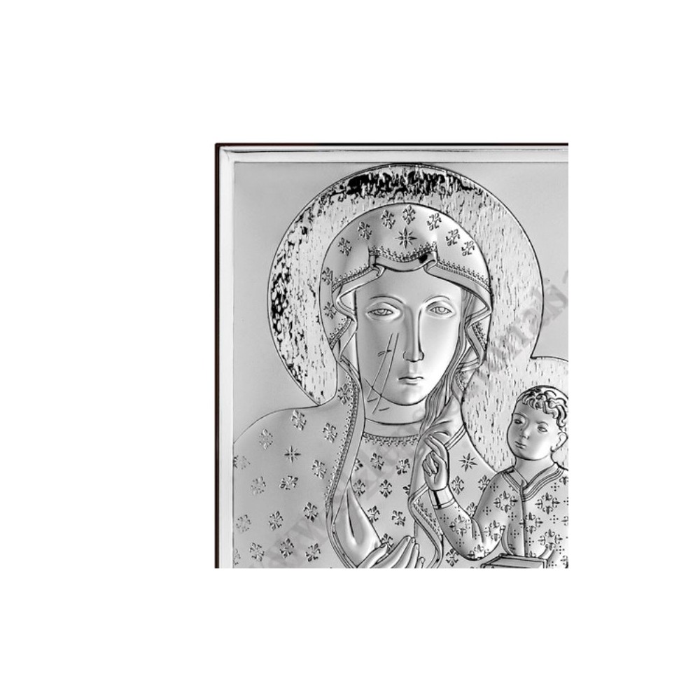 Srebrny obrazek przedstawiający wizerunek Matki Bożej Częstochowskiej wykonany z metalu dwuwarstwowego, aluminium i srebra. Zewnętrzna warstwa srebra o próbie 925 została pokryta dla zabezpieczenia warstwą lakieru. Rewers obrazka wykonany jest z eleganckiego drewna najwyższej jakości. Obrazek można powiesić na ścianie lub postawić na półce. Obrazek zapakowany jest w eleganckie kartonowe pudełko.