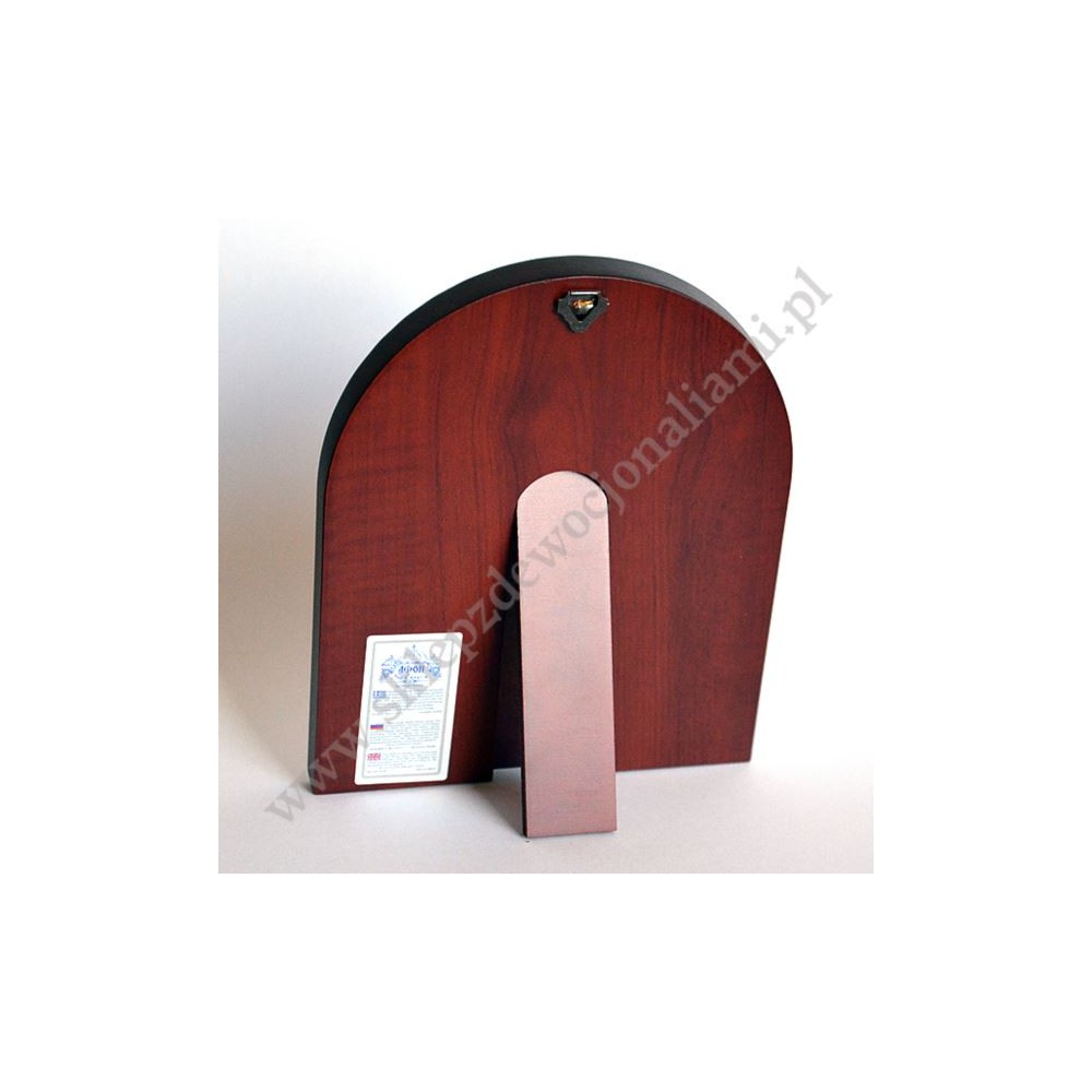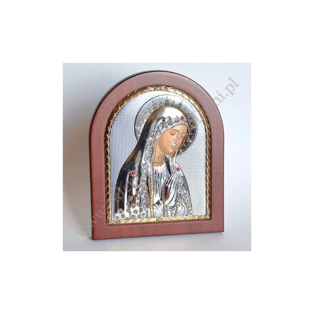 Ikona Matki Bożej Fatimskiej wykonana techniką sitodruku w drewnie, oprawiona wytłaczanym stopem z naniesioną warstwą srebra i elementami złotymi, pokryta specjalnym lakierem ochronnym, zdobiona dodatkowo kamieniami. Szerokość ikony 14.8 cm , wysokość 18 cm. Ikona z możliwością powieszenia i postawienia.