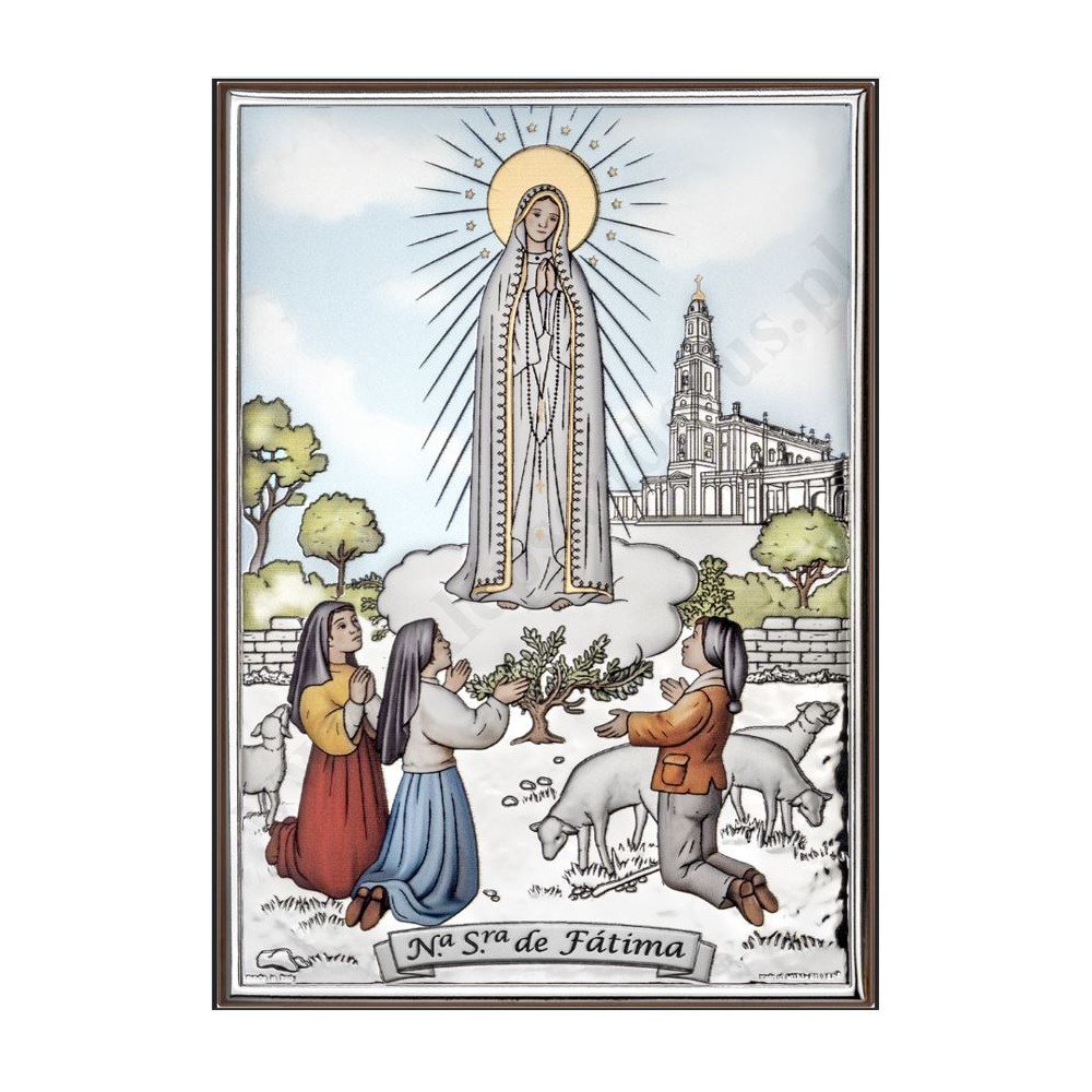 Srebrny obrazek koloryzowany przedstawiający Matkę Bożą Fatimską . Rozmiar obrazka 13 x 18 cm. PONIŻEJ W PRODUKTACH POWIĄZANYCH ISTNIEJE MOŻLIWOŚĆ ZAMÓWIENIA OKAZJONALNEJ DEDYKACJI NA TABLICZCE LUB REWERSIE OBRAZKA.