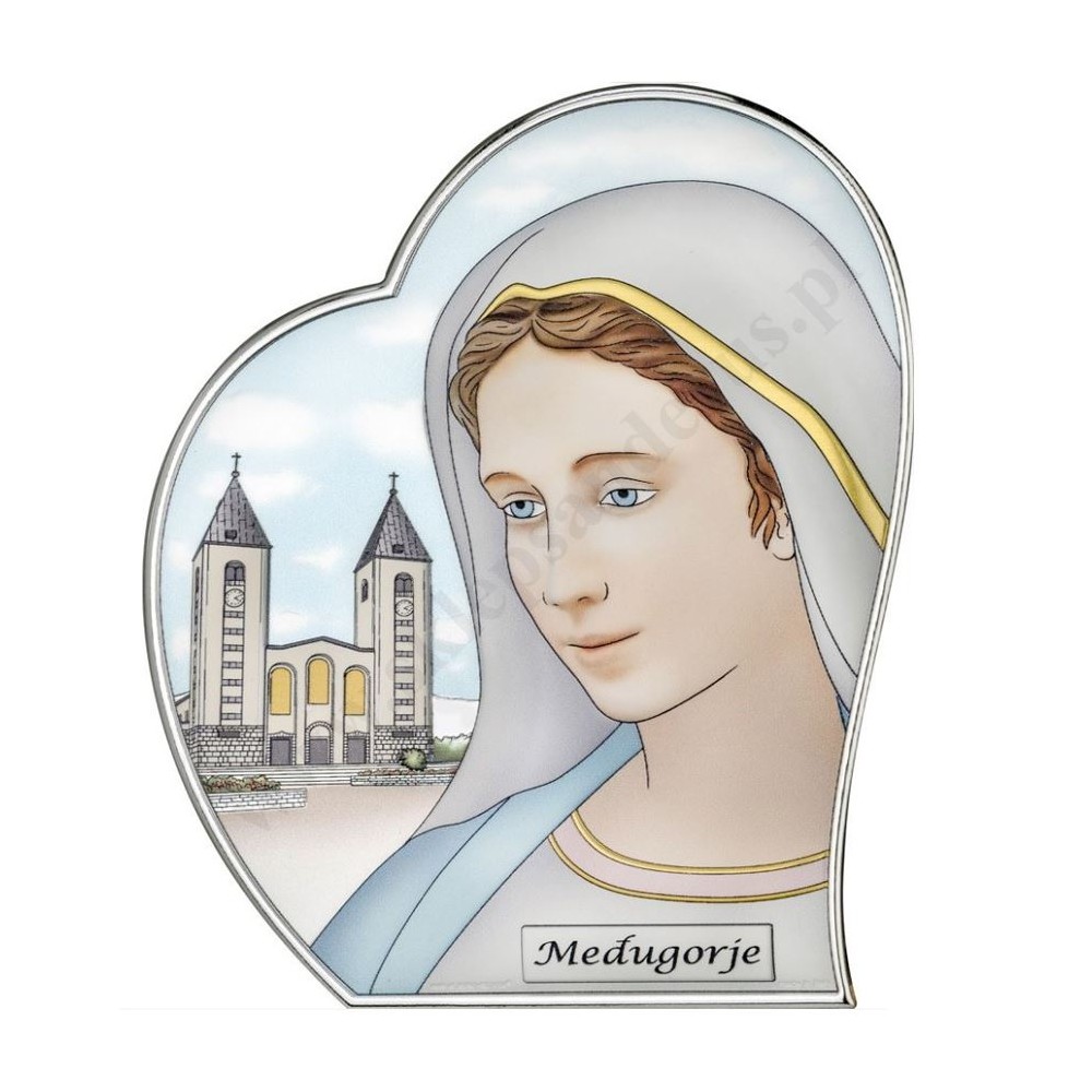 Srebrny obrazek koloryzowany przedstawiający Matkę Bożą z Medugorje . Rozmiar obrazka 16 x 20 cm. PONIŻEJ W PRODUKTACH POWIĄZANYCH ISTNIEJE MOŻLIWOŚĆ ZAMÓWIENIA OKAZJONALNEJ DEDYKACJI NA TABLICZCE LUB REWERSIE OBRAZKA.