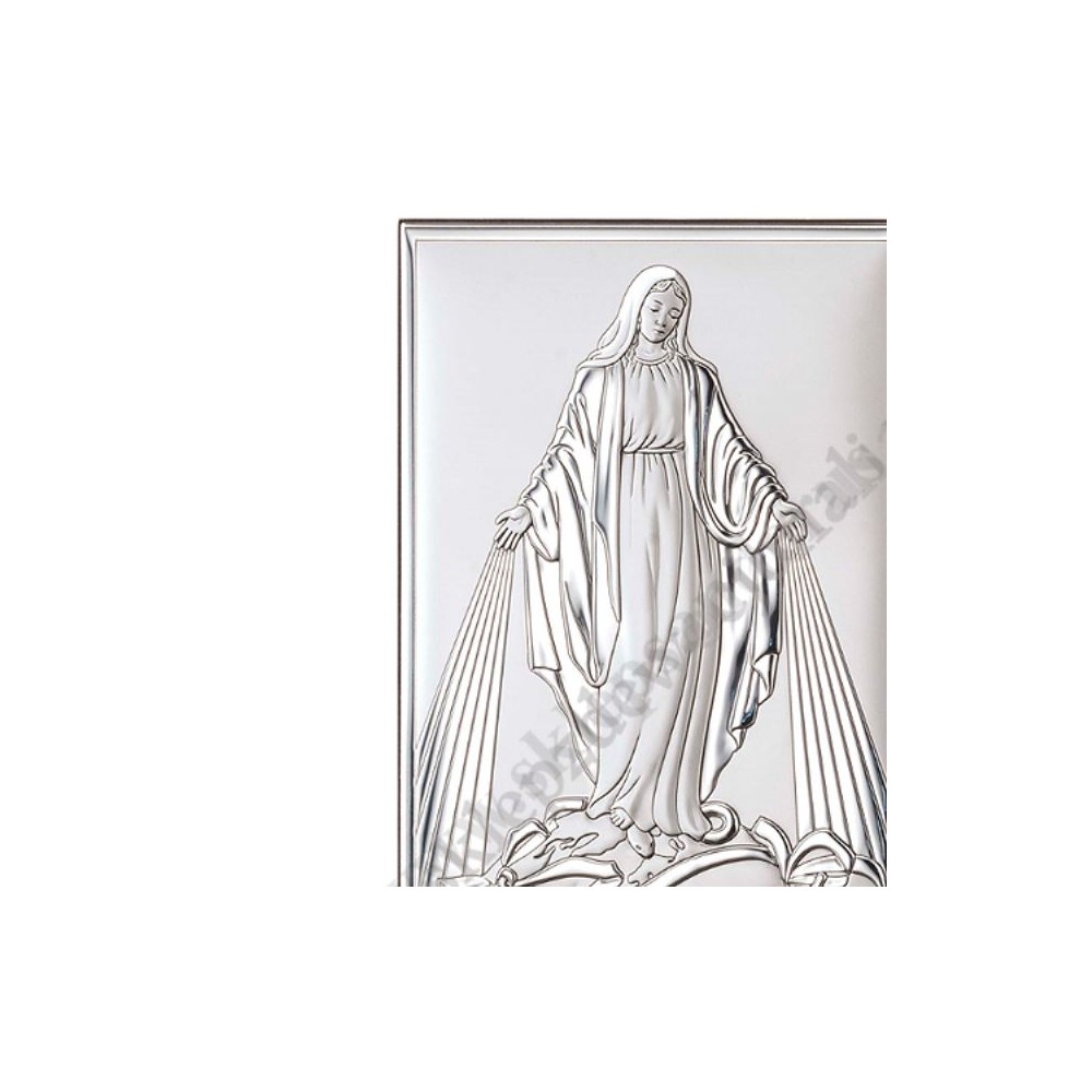 Srebrny obrazek przedstawiający wizerunek Matki Bożej Niepokalanej wykonany z metalu dwuwarstwowego, aluminium i srebra. Zewnętrzna warstwa srebra o próbie 925 została pokryta dla zabezpieczenia warstwą lakieru. Rewers obrazka wykonany jest z eleganckiego drewna najwyższej jakości. Obrazek można powiesić na ścianie lub postawić na półce. Obrazek zapakowany jest w eleganckie kartonowe pudełko.