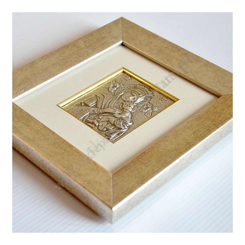 Obrazek wykonany z blaszki metalowej oksydowanej z elementami barwionymi lakierem w kolorze złota, całość polakierowana lakierem bezbarwnym. Płaskorzeźba oprawiona w passe-partou i drenianą ramkę. Ramka ze stopką do postawienia i zawieszką przesuwną. Całość zapakowana w kartonowe pudełko z okienkiem. Wymiar obrazka 16.3 x 17.7 cm.