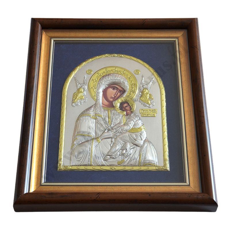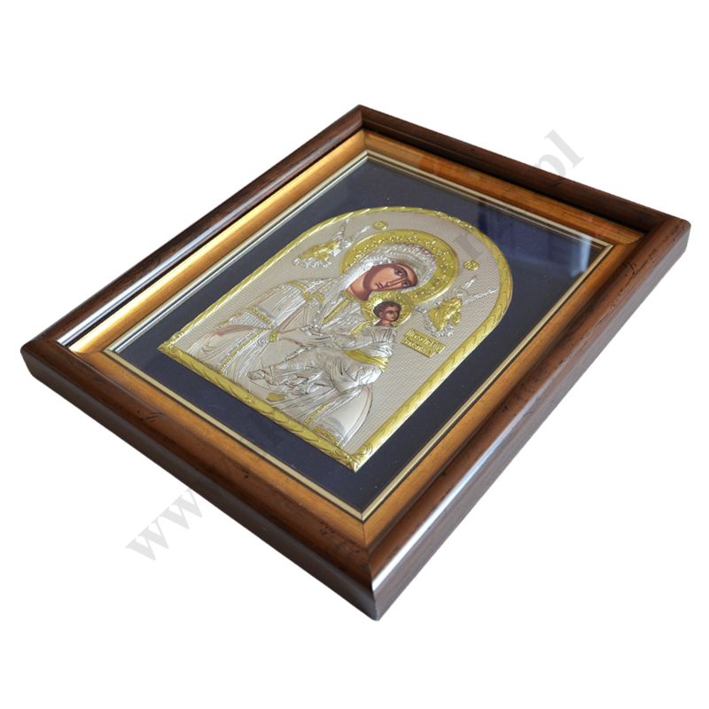 Ikona przedstawiająca Matkę Bożą Nieustającej Pomocy wykonana techniką sitodruku w drewnie i płótnie, oprawiona wytłaczanym stopem PVD ze srebrem, pokrytym specjalnym lakierem ochronnym. Oprawiona w drewnianej, zdobionej ramce za szkłem.