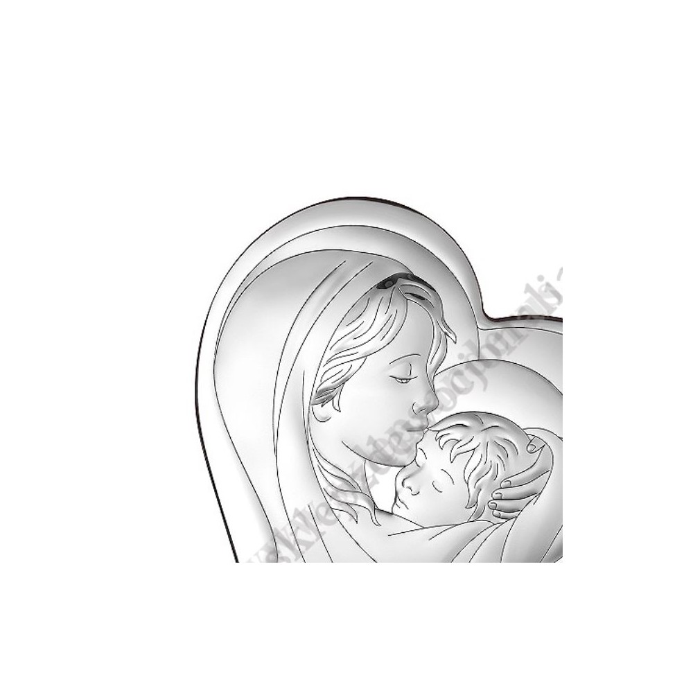 Srebrny obrazek przedstawiający wizerunek Matki Bożej z Dzieciątkiem wykonany z metalu dwuwarstwowego, aluminium i srebra. Zewnętrzna warstwa srebra o próbie 925 została pokryta dla zabezpieczenia warstwą lakieru. Rewers obrazka wykonany jest z eleganckiego drewna najwyższej jakości. Obrazek można powiesić na ścianie lub postawić na półce. Obrazek zapakowany jest w eleganckie kartonowe pudełko.