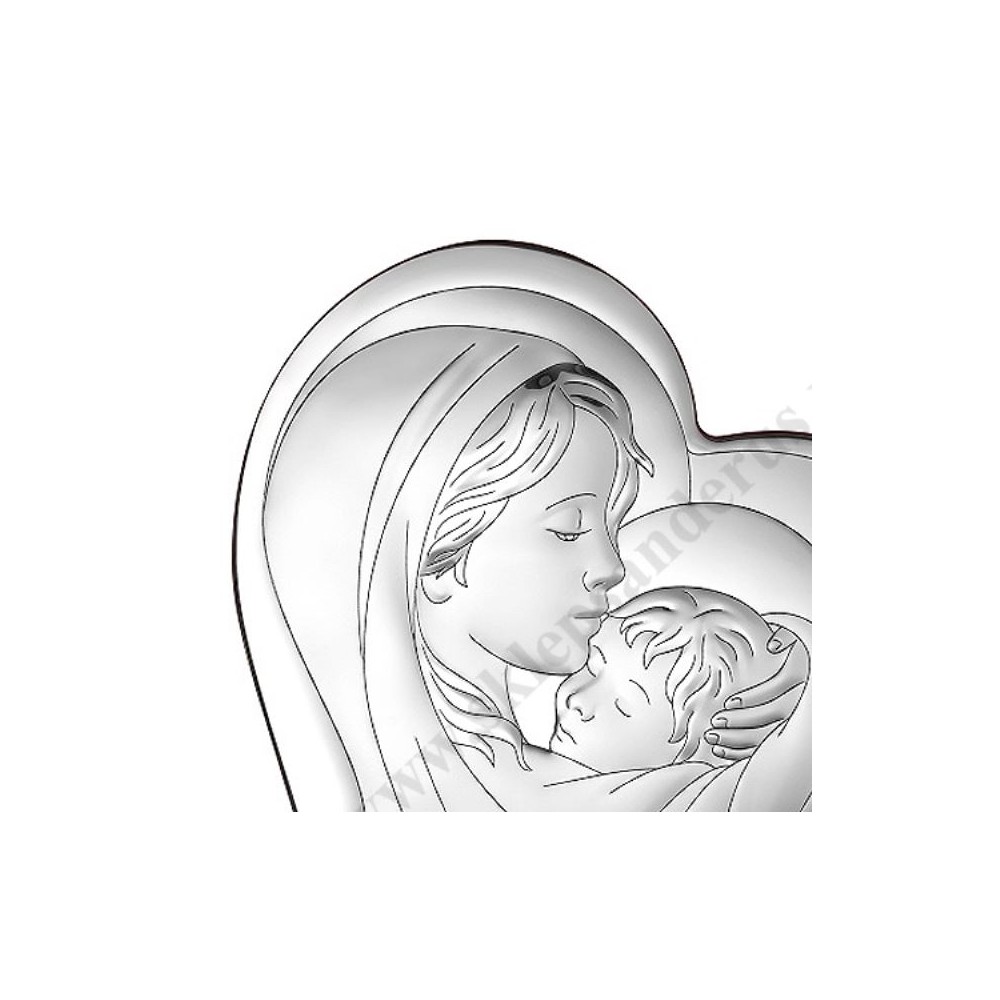 Srebrny obrazek przedstawiający wizerunek Matki Bożej z Dzieciątkiem wykonany z metalu dwuwarstwowego, aluminium i srebra. Zewnętrzna warstwa srebra o próbie 925 została pokryta dla zabezpieczenia warstwą lakieru. Rewers obrazka wykonany jest z eleganckiego drewna najwyższej jakości. Obrazek można powiesić na ścianie lub postawić na półce. Obrazek zapakowany jest w eleganckie kartonowe pudełko.