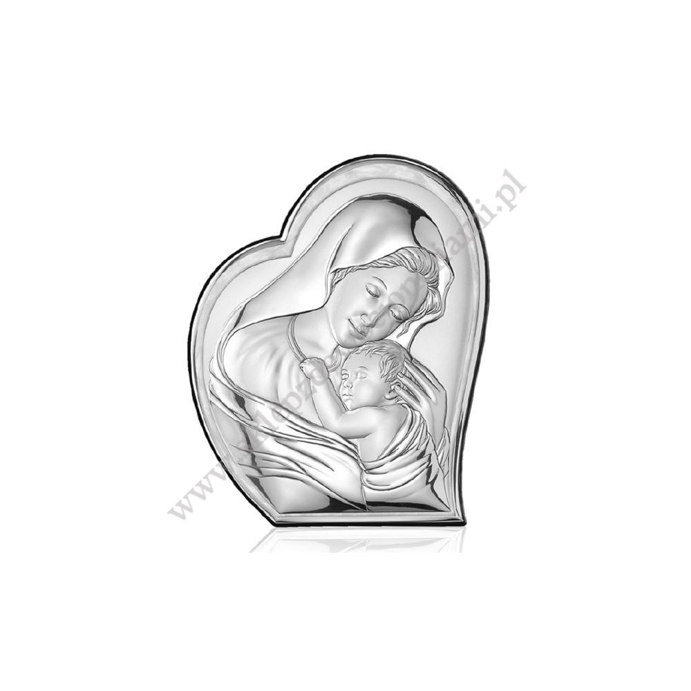 Srebrny obrazek przedstawiający wizerunek Matki Bożej z Dzieciątkiem wykonany z metalu dwuwarstwowego, aluminium i srebra. Zewnętrzna warstwa srebra o próbie 925 została pokryta dla zabezpieczenia warstwą lakieru. Rewers obrazka wykonany jest z eleganckiego drewna najwyższej jakości. Obrazek można powiesić na ścianie lub postawić na półce. Obrazek zapakowany jest w eleganckie kartonowe pudełko.