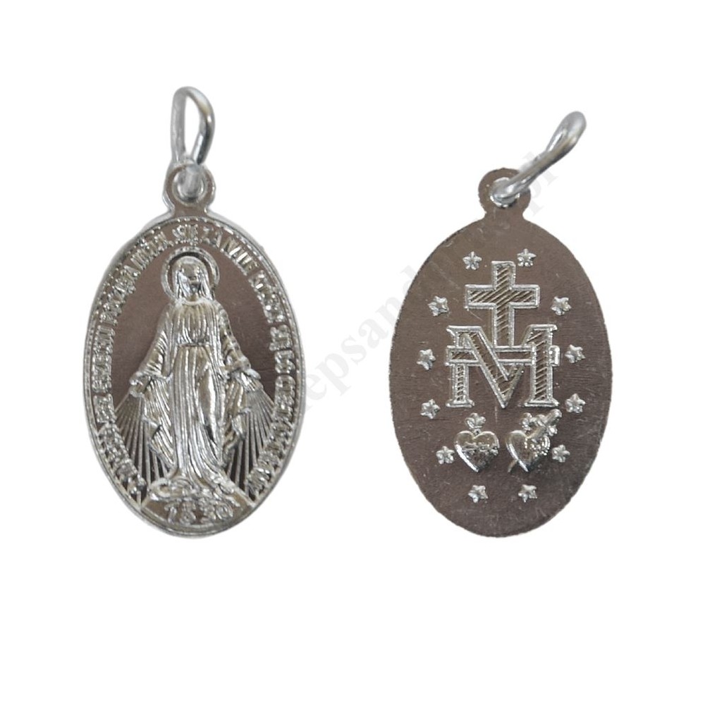 Metalowy Cudowny Medalik o wysokości 2.4 cm (z koluszkiem) i szerokości 1.4 cm.