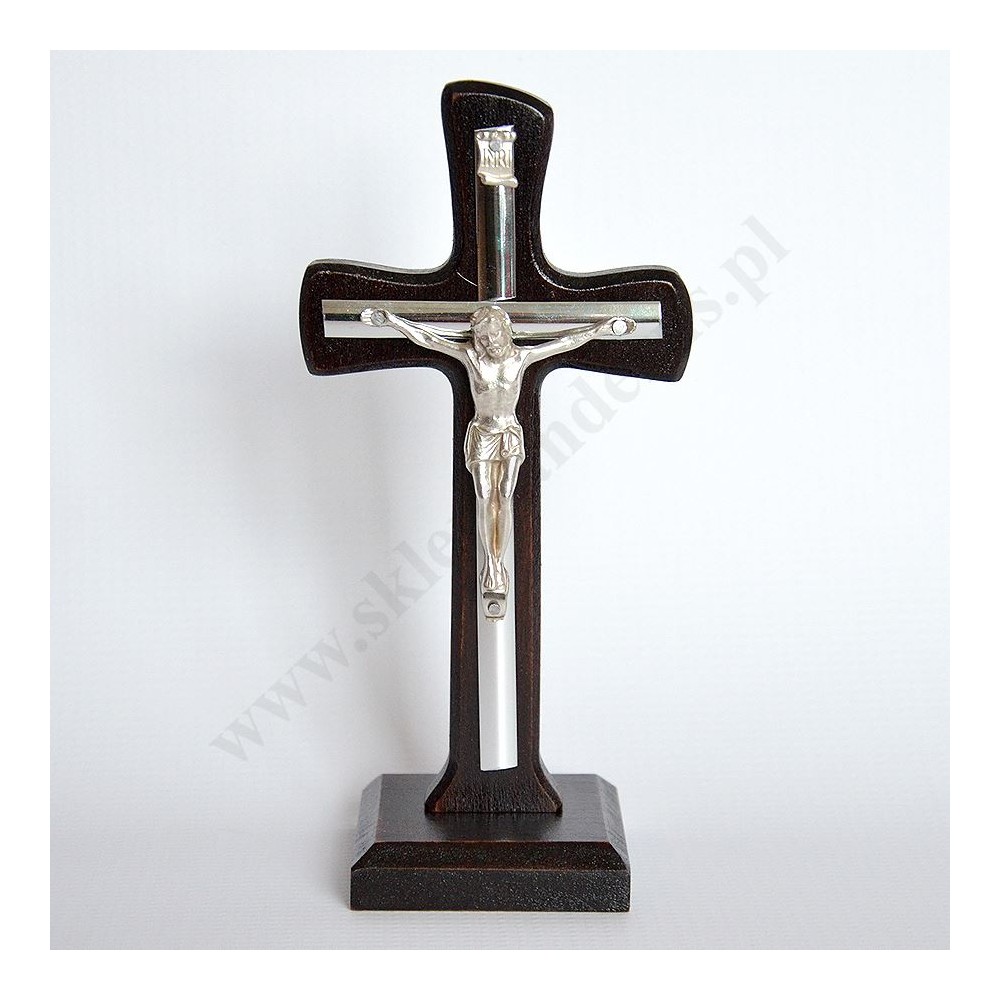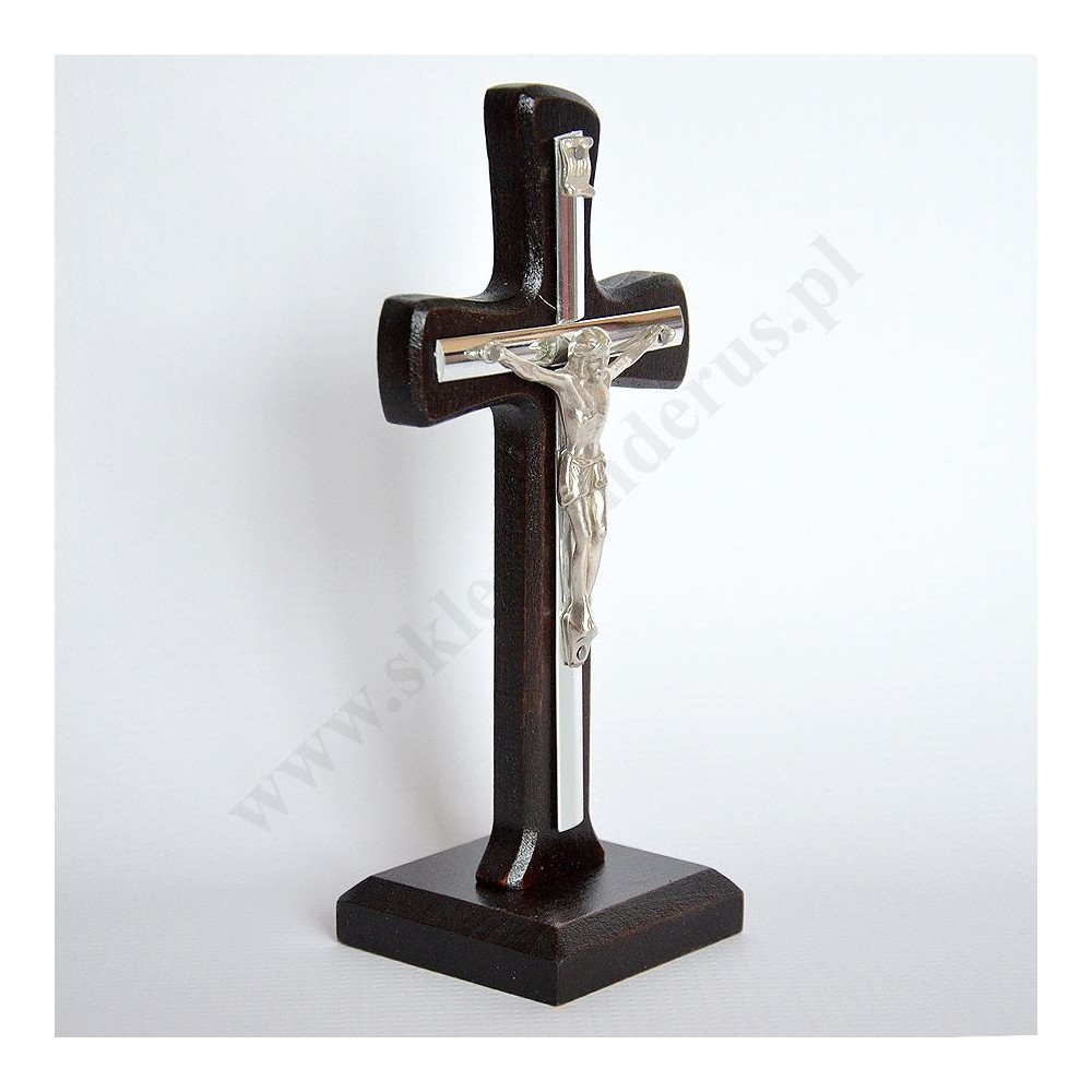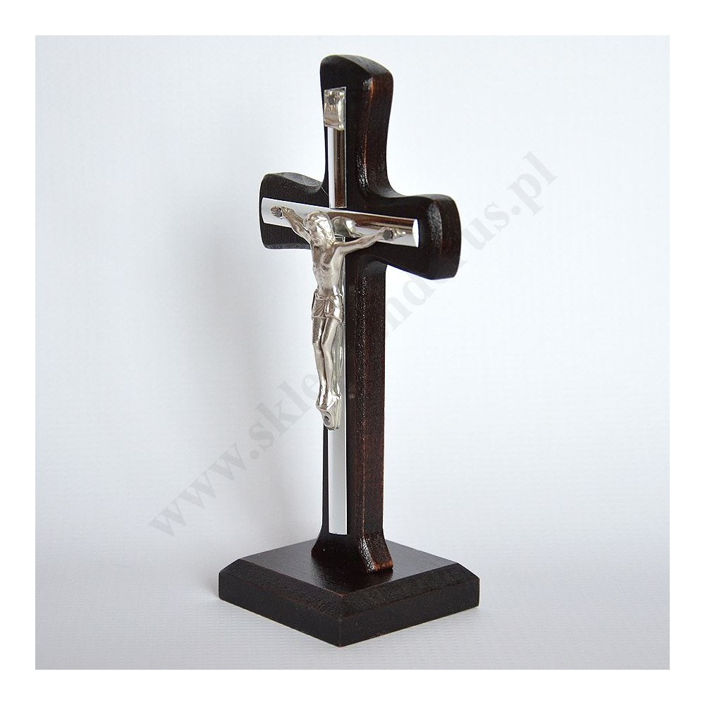 Drewniany krzyżyk stojący z metalową wstawką oraz z metalowym korpusem Pana Jezusa. Wysokość krzyżyka 17.5 cm, szerokość 8.4 cm.