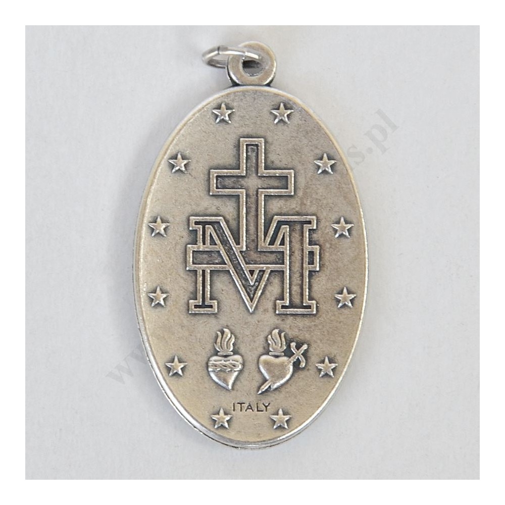 Metalowy medalik Matki Bożej Niepokalanej o wysokości 4.5 cm (z koluszkiem) i szerokości 2.5 cm.
