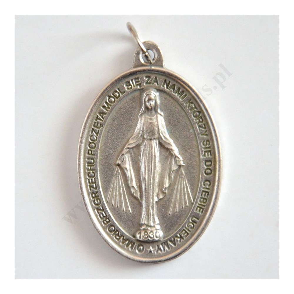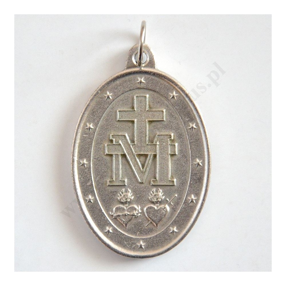 Aluminiowy oksydowany medalik Matki Bożej Niepokalanej, tak zwany "Cudowny Medalik" o wysokości 4 cm i szerokości 2.8 cm.