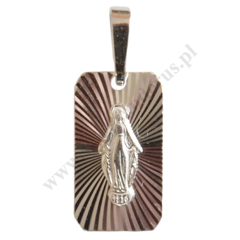 Srebrny medalik Matki Bożej Niepokalanej o wysokość z uchwytem 2.4 cm i szerokości 1 cm. Srebro próba 925, 1.700 gr.