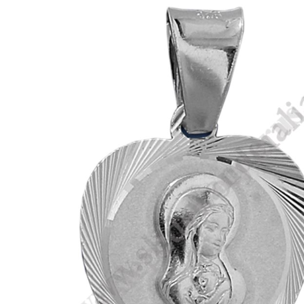 Srebrny medalik Matki Bożej o wysokości 1.7 cm (bez koluszka) i szerokości 1.4 cm. Srebro próba 925, 2.000 gr.