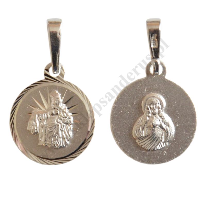 Srebrny medalik Matki Bożej Szkaplerznej na rewersie Serce Pana Jezusa, wysokość medalika z uszkiem 2.5 cm, szerokość medalika 1.4 cm. Srebro próba 925, waga 1.900 gr.