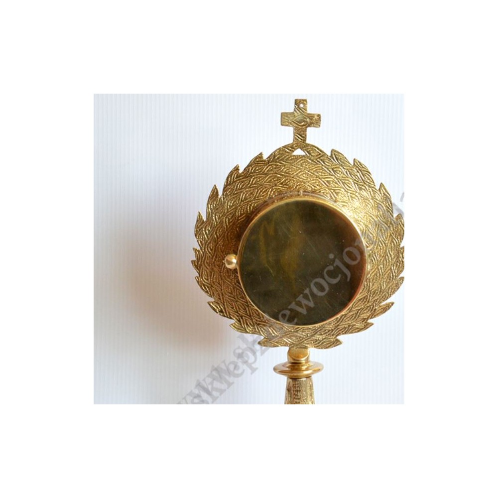 Mini monstrancja mosiężna o wysokości 27.5 cm, szerokość w najszerszym miejscu 16 cm, średnica w podstawie 13 cm, średnica wewnętrzna luny 8.5 cm, doskonale pasuje na hostię o średnicy do 6 cm.